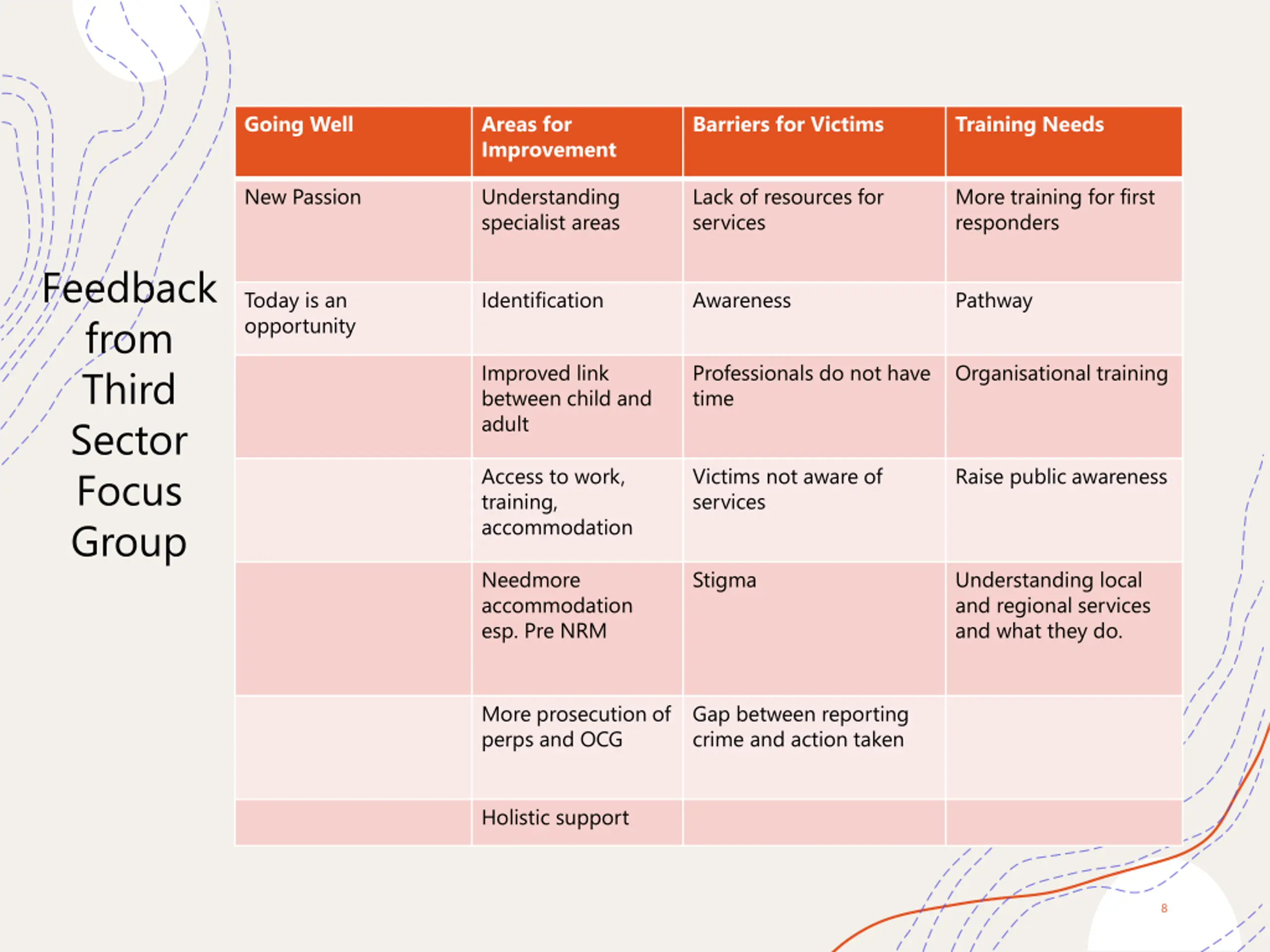 Going Well Areas for Improvement Barriers for Victims Training Needs New Passion Understanding specialist areas Lack of resources for services More training for first responders Feedback from Third Sector Focus Group Today is an opportunity Identification Awareness Pathway Improved link between child and adult Professionals do not have time Organisational training Access to work, training, accommodation Victims not aware of services Raise public awareness Needmore accommodation esp. Pre NRM Stigma Understanding local and regional services and what they do. More prosecution of perps and OCG Gap between reporting crime and action taken Holistic support 8