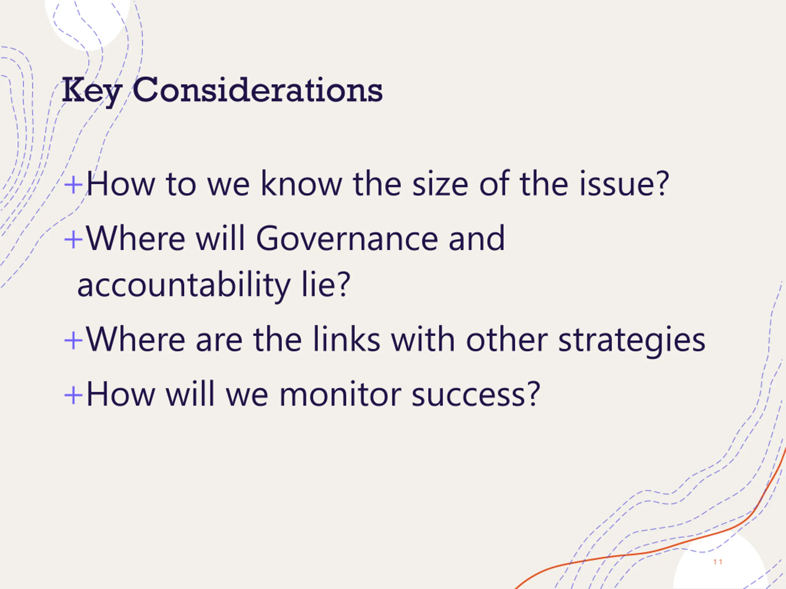 Key Considerations +How to we know the size of the issue? +Where will Governance and accountability lie? +Where are the links with other strategies +How will we monitor success? 1 1