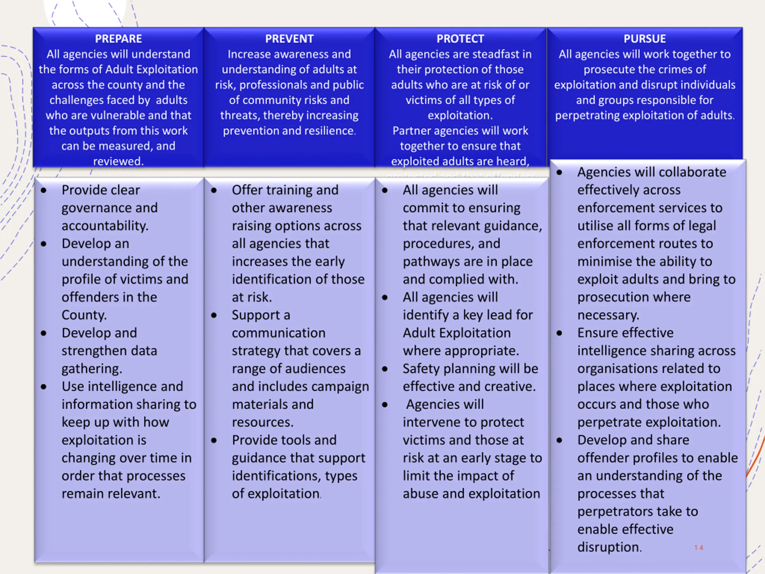 PREPARE PREVENT PROTECT PURSUE All agencies will understand the forms of Adult Exploitation across the county and the challenges faced by adults who are vulnerable and that the outputs from this work can be measured, and reviewed. Increase awareness and understanding of adults at risk, professionals and public of community risks and threats, thereby increasing prevention and resilience. All agencies are steadfast in their protection of those adults who are at risk of or victims of all types of exploitation. Partner agencies will work together to ensure that exploited adults are heard, protected and that offenders will be held to account. All agencies will commit to ensuring that relevant guidance, procedures, and pathways are in place and complied with. All agencies will identify a key lead for Adult Exploitation where appropriate. Safety planning will be effective and creative. Agencies will intervene to protect victims and those at risk at an early stage to limit the impact of abuse and exploitation All agencies will work together to prosecute the crimes of exploitation and disrupt individuals and groups responsible for perpetrating exploitation of adults. Agencies will collaborate effectively across enforcement services to utilise all forms of legal enforcement routes to minimise the ability to exploit adults and bring to prosecution where necessary. Ensure effective intelligence sharing across organisations related to places where exploitation occurs and those who perpetrate exploitation. Develop and share offender profiles to enable an understanding of the processes that perpetrators take to enable effective disruption. Provide clear governance and accountability. Develop an understanding of the profile of victims and offenders in the County. Develop and strengthen data gathering. Use intelligence and information sharing to keep up with how exploitation is changing over time in order that processes remain relevant. Offer training and other awareness raising options across all agencies that increases the early identification of those at risk. Support a communication strategy that covers a range of audiences and includes campaign materials and resources. Provide tools and guidance that support identifications, types of exploitation. 1 4
