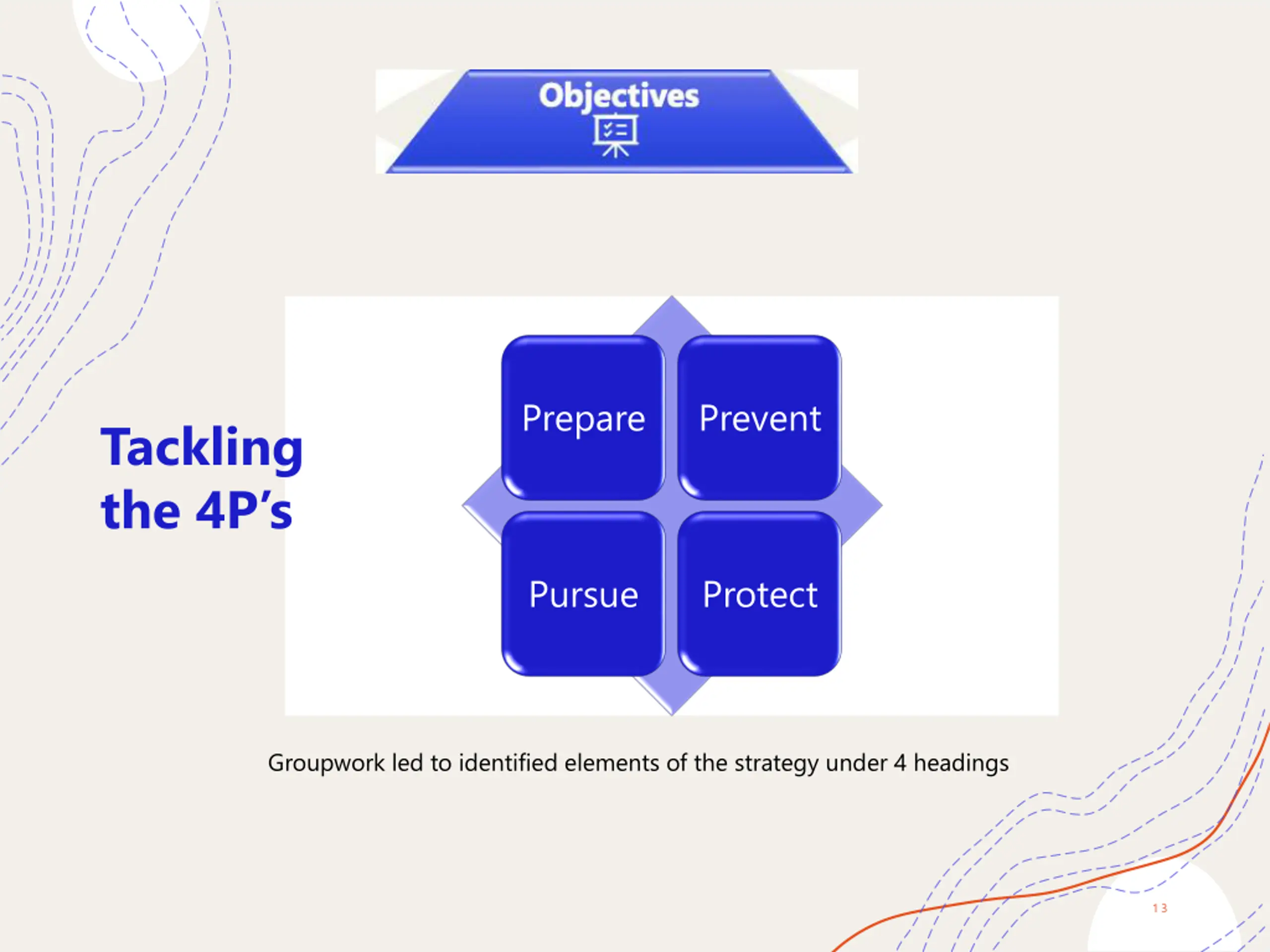 Prepare Prevent Tackling the 4P s Pursue Protect Groupwork led to identified elements of the strategy under 4 headings 1 3
