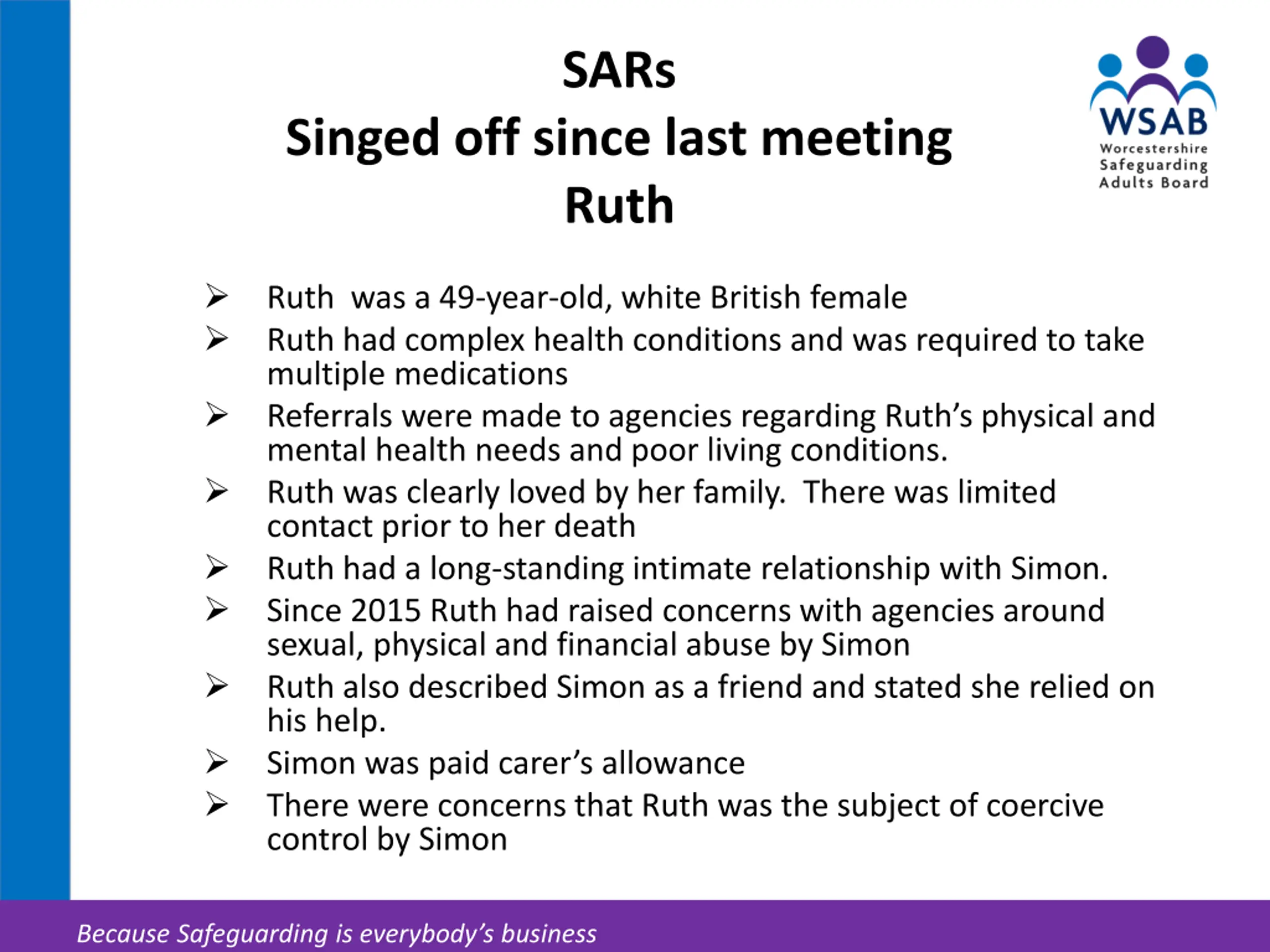 SARs Singed off since last meeting Ruth Ruth was a 49-year-old, white British female Ruth had complex health conditions and was required to take multiple medications Referrals were made to agencies regarding Ruth s physical and mental health needs and poor living conditions. Ruth was clearly loved by her family. There was limited contact prior to her death Ruth had a long-standing intimate relationship with Simon. Since 2015 Ruth had raised concerns with agencies around sexual, physical and financial abuse by Simon Ruth also described Simon as a friend and stated she relied on his help. Simon was paid carer s allowance There were concerns that Ruth was the subject of coercive control by Simon Because Safeguarding is everybody s business