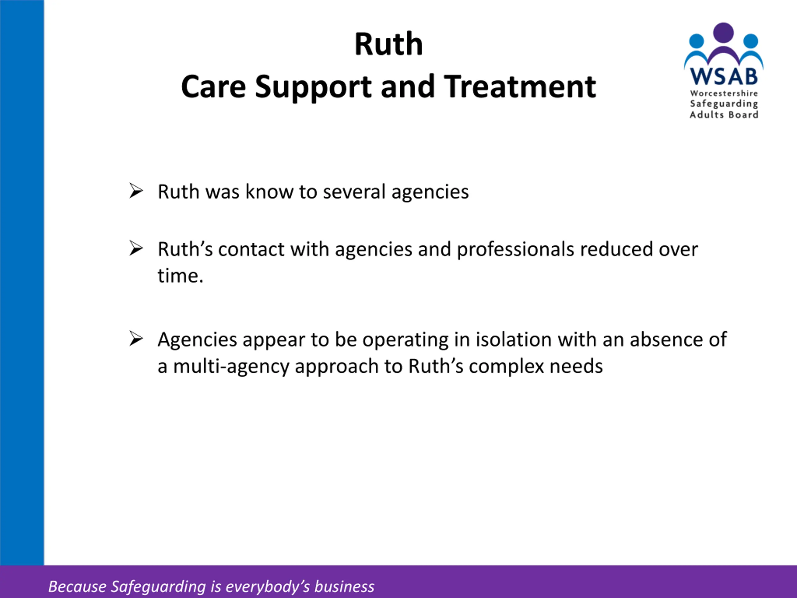 Ruth Care Support and Treatment Ruth was know to several agencies Ruth s contact with agencies and professionals reduced over time. Agencies appear to be operating in isolation with an absence of a multi-agency approach to Ruth s complex needs Because Safeguarding is everybody s business