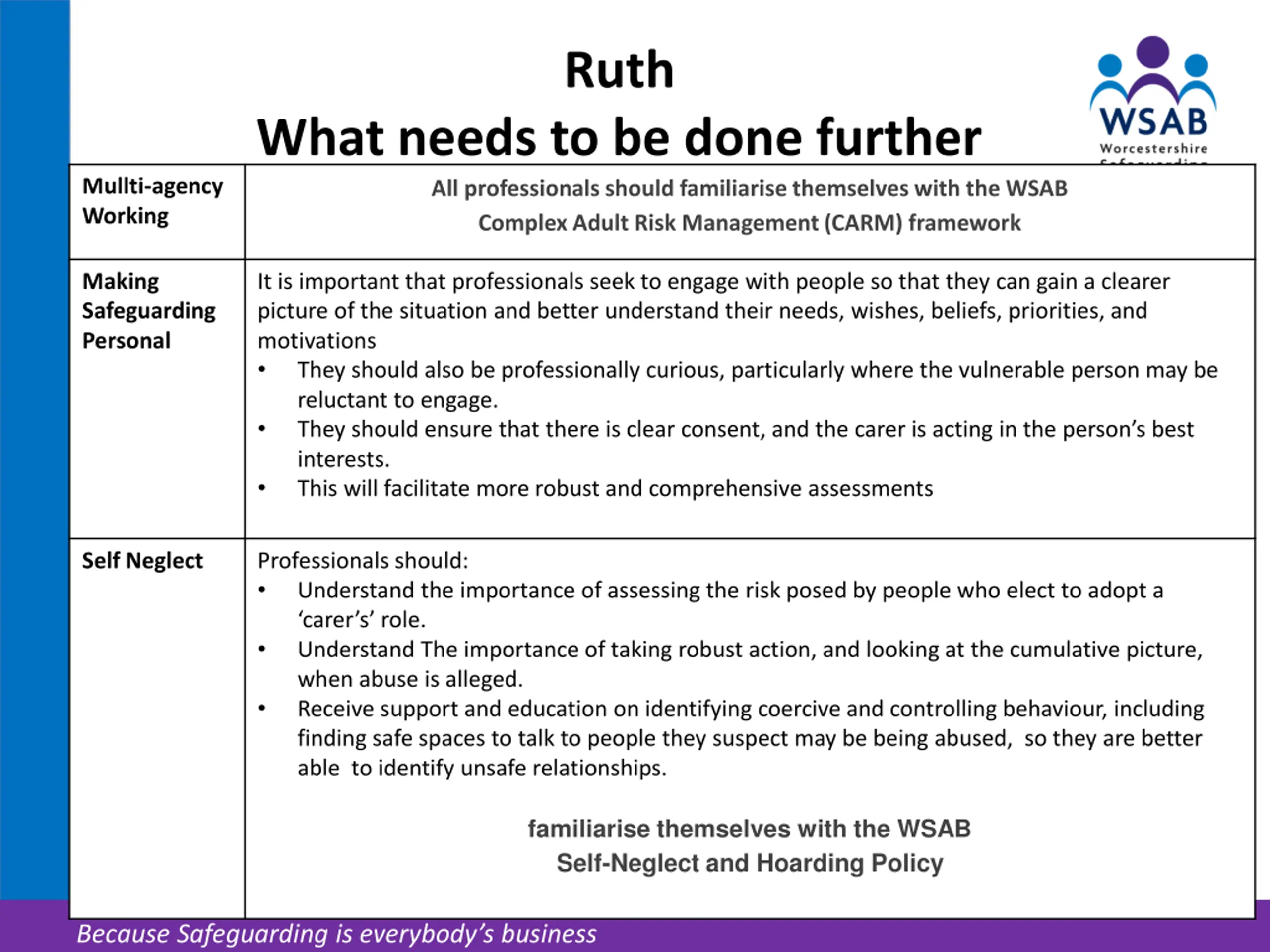 Ruth What needs to be done further All professionals should familiarise themselves with the WSAB Complex Adult Risk Management (CARM) framework Mullti-agency Working Making Safeguarding Personal It is important that professionals seek to engage with people so that they can gain a clearer picture of the situation and better understand their needs, wishes, beliefs, priorities, and motivations They should also be professionally curious, particularly where the vulnerable person may be reluctant to engage. They should ensure that there is clear consent, and the carer is acting in the person s best interests. This will facilitate more robust and comprehensive assessments Self Neglect Professionals should: Understand the importance of assessing the risk posed by people who elect to adopt a carer s role. Understand The importance of taking robust action, and looking at the cumulative picture, when abuse is alleged. Receive support and education on identifying coercive and controlling behaviour, including finding safe spaces to talk to people they suspect may be being abused, so they are better able to identify unsafe relationships. familiarise themselves with the WSAB Self-Neglect and Hoarding Policy Because Safeguarding is everybody s business