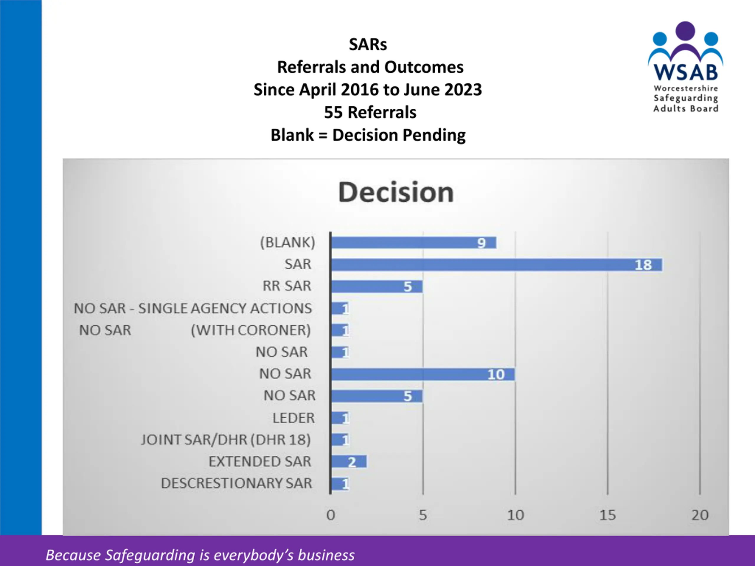 SARs Referrals and Outcomes Since April 2016 to June 2023 55 Referrals Blank = Decision Pending Because Safeguarding is everybody s business