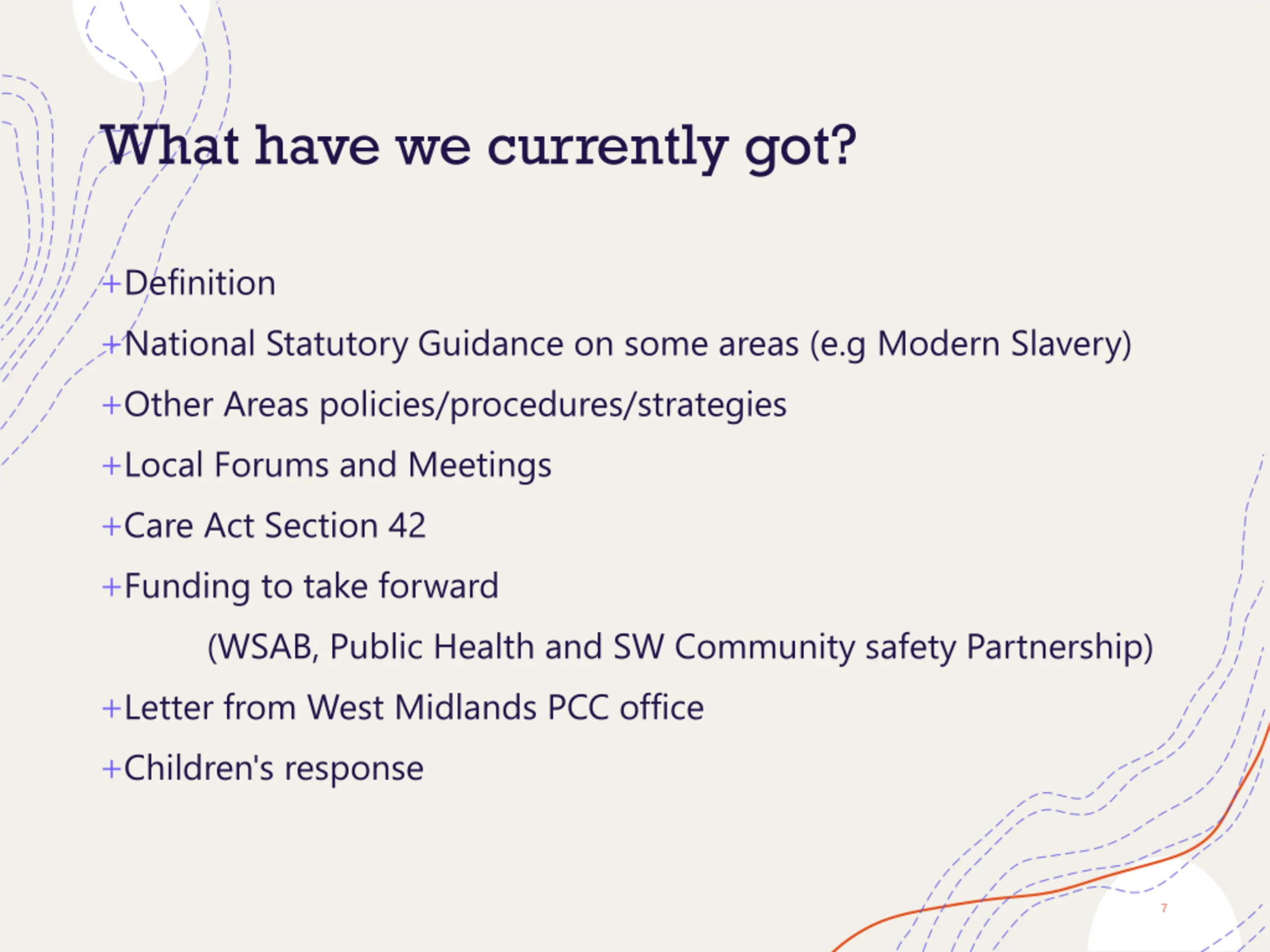 What have we currently got? +Definition +National Statutory Guidance on some areas (e.g Modern Slavery) +Other Areas policies/procedures/strategies +Local Forums and Meetings +Care Act Section 42 +Funding to take forward (WSAB, Public Health and SW Community safety Partnership) +Letter from West Midlands PCC office +Children's response 7