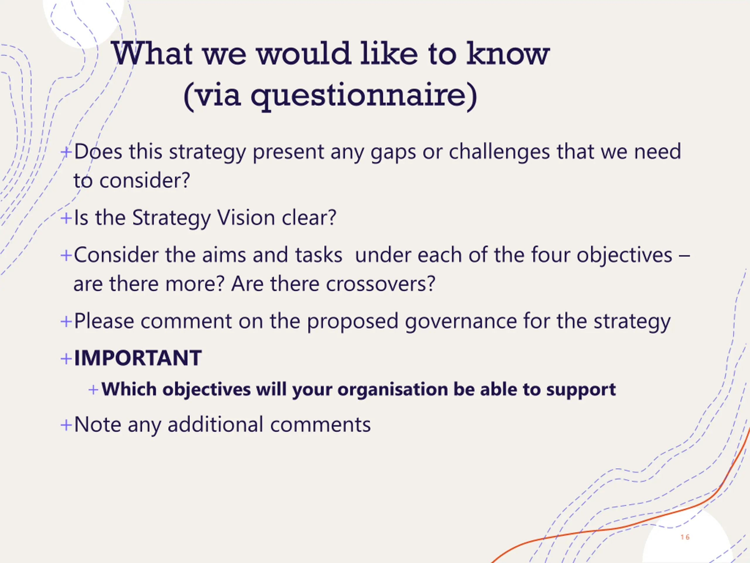 What we would like to know (via questionnaire) +Does this strategy present any gaps or challenges that we need to consider? +Is the Strategy Vision clear? +Consider the aims and tasks under each of the four objectives are there more? Are there crossovers? +Please comment on the proposed governance for the strategy +IMPORTANT +Which objectives will your organisation be able to support +Note any additional comments 1 6