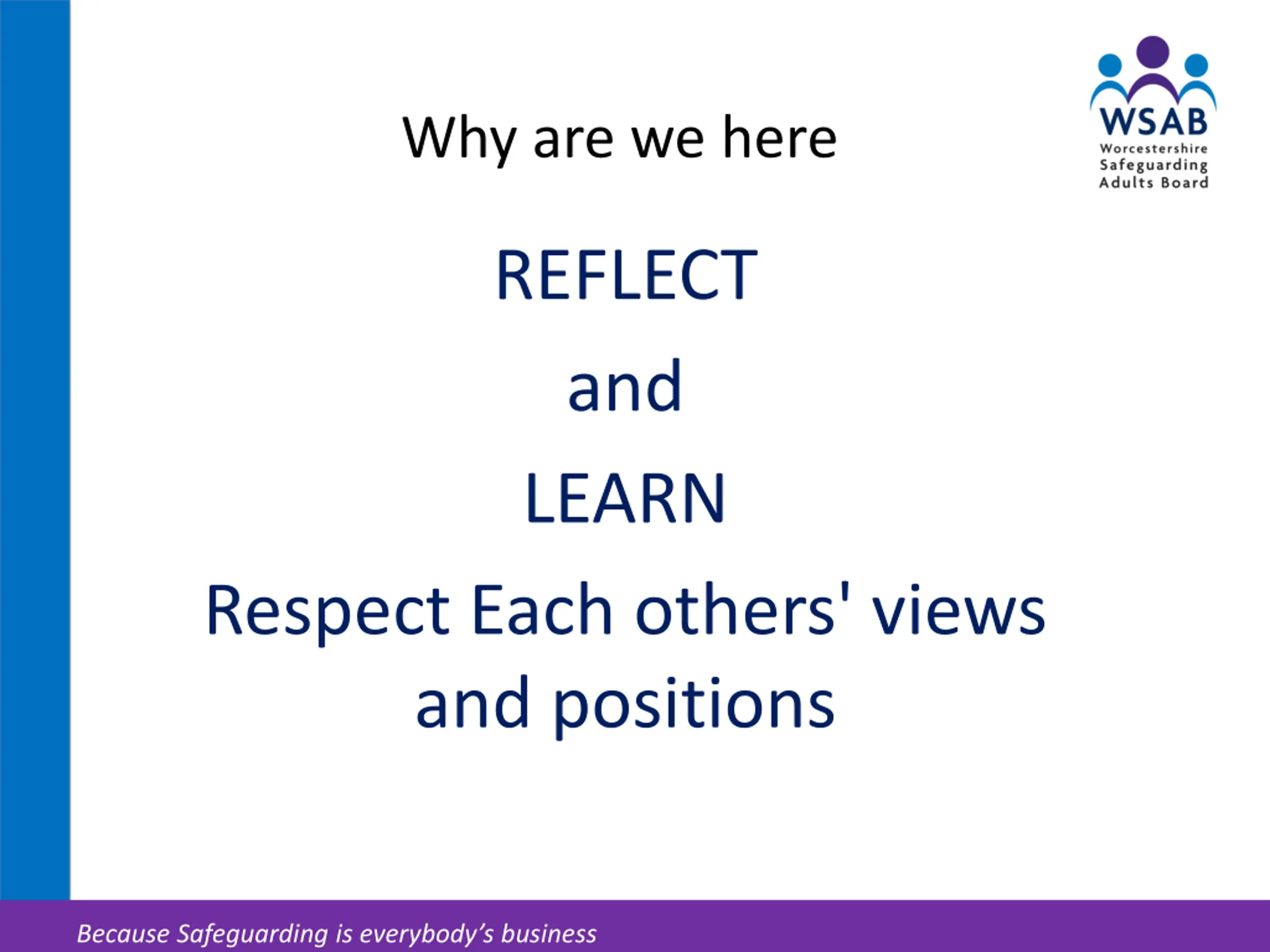 Why are we here REFLECT and LEARN Respect Each others' views and positions Because Safeguarding is everybody s business