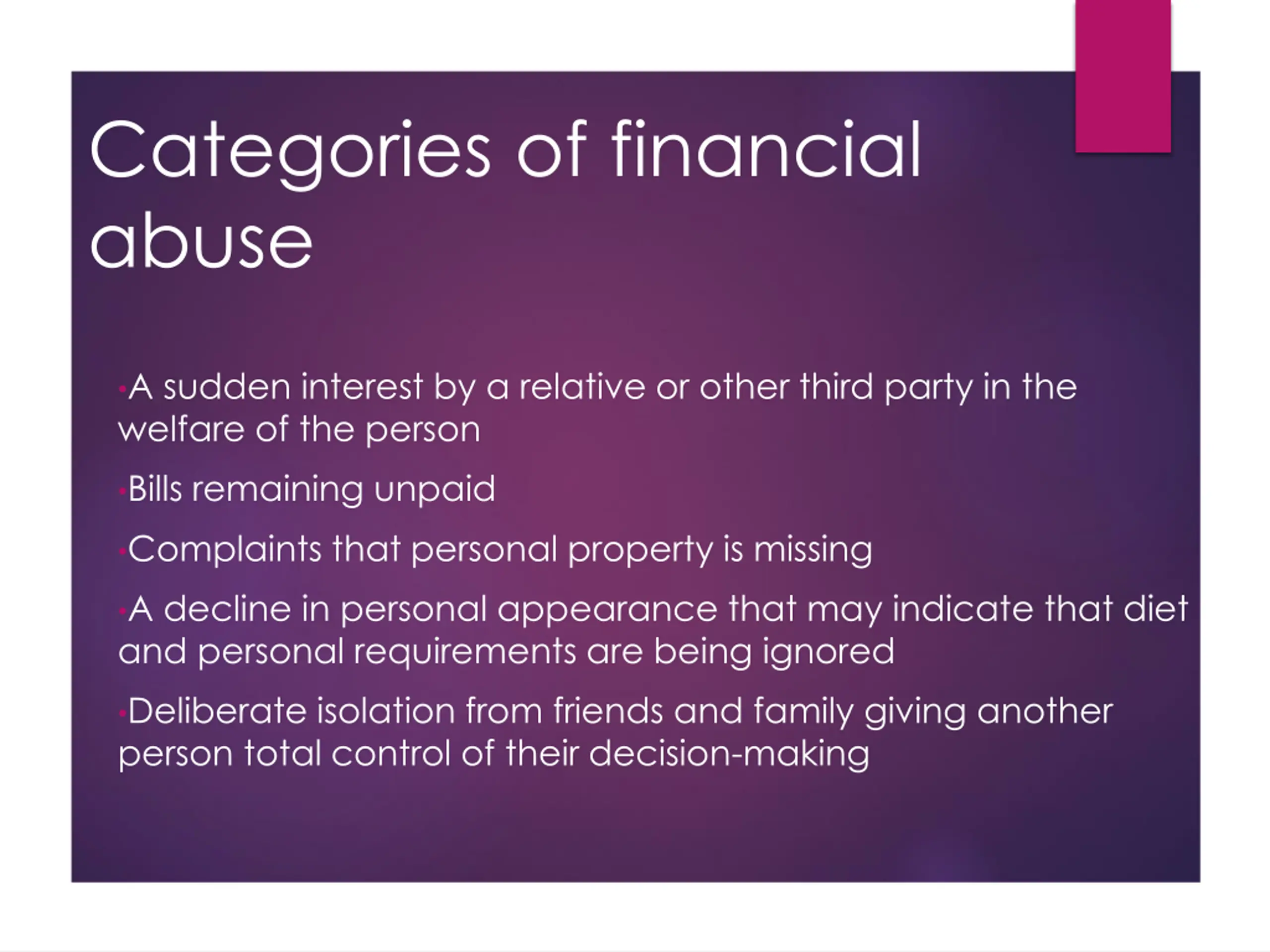 Categories of financial abuse A sudden interest by a relative or other third party in the welfare of the person Bills remaining unpaid Complaints that personal property is missing A decline in personal appearance that may indicate that diet and personal requirements are being ignored Deliberate isolation from friends and family giving another person total control of their decision-making