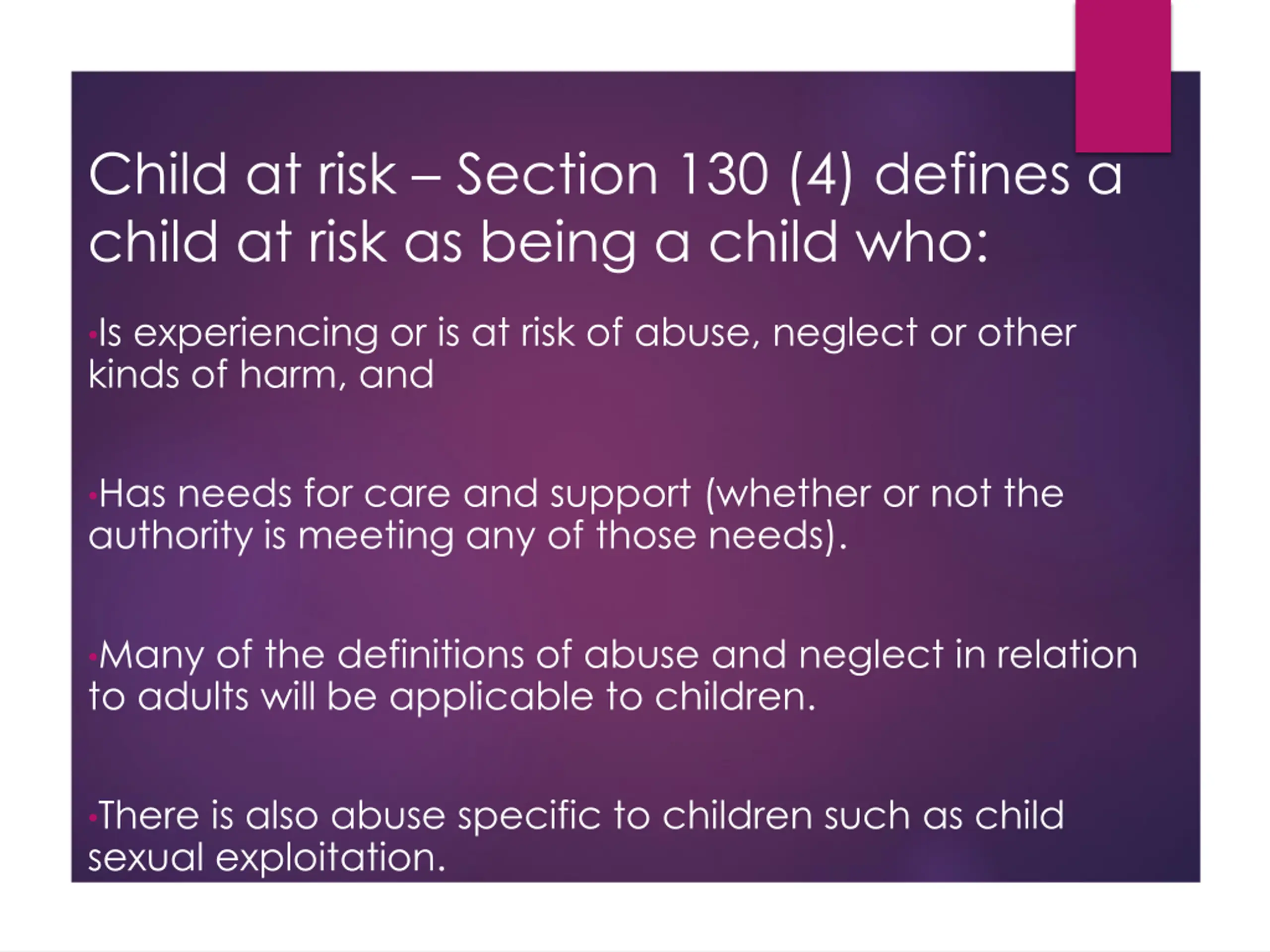 Child at risk Section 130 (4) defines a child at risk as being a child who: Is experiencing or is at risk of abuse, neglect or other kinds of harm, and Has needs for care and support (whether or not the authority is meeting any of those needs). Many of the definitions of abuse and neglect in relation to adults will be applicable to children. There is also abuse specific to children such as child sexual exploitation.