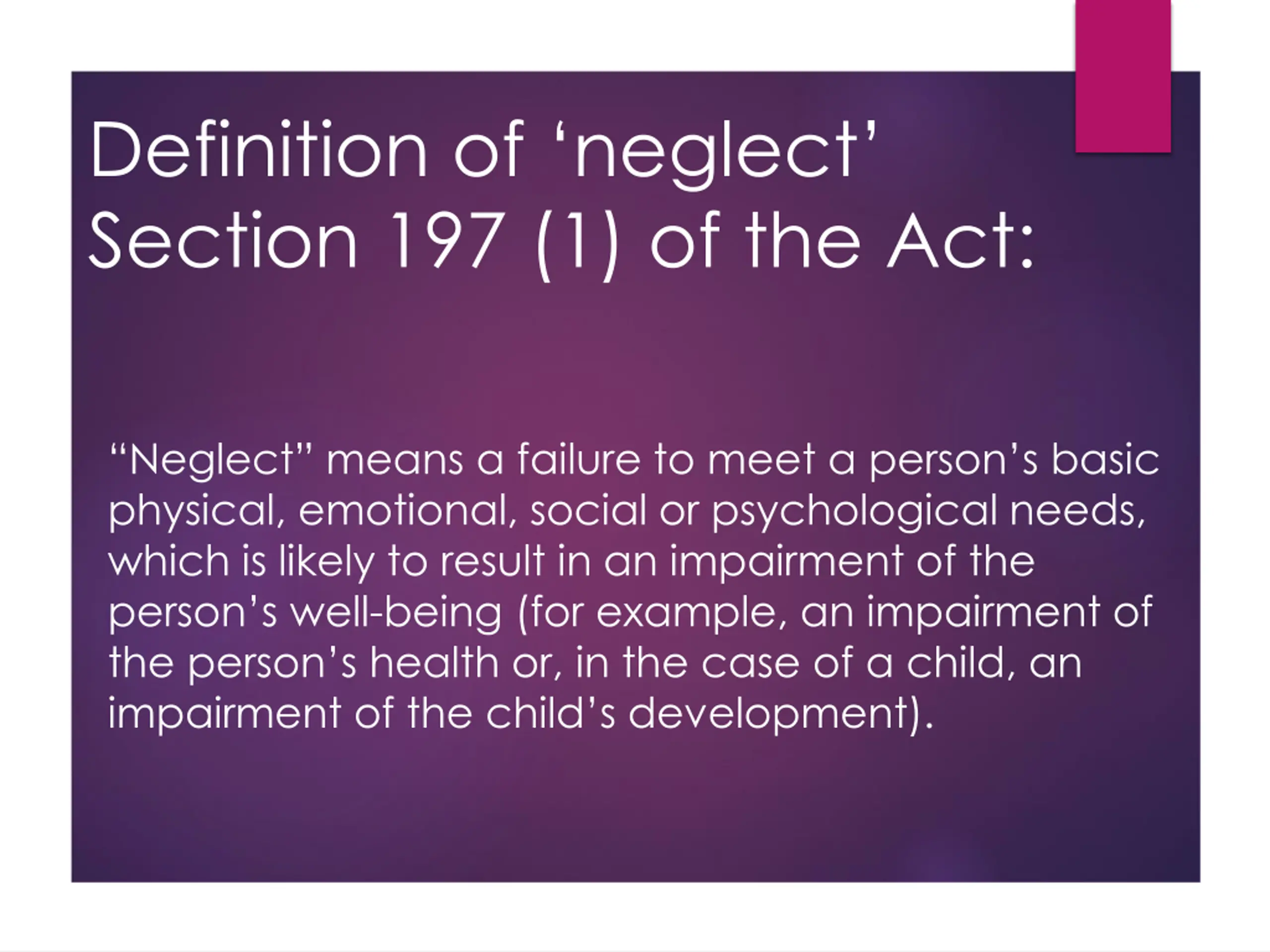 Definition of neglect Section 197 (1) of the Act: Neglect means a failure to meet a person s basic physical, emotional, social or psychological needs, which is likely to result in an impairment of the person s well-being (for example, an impairment of the person s health or, in the case of a child, an impairment of the child s development).