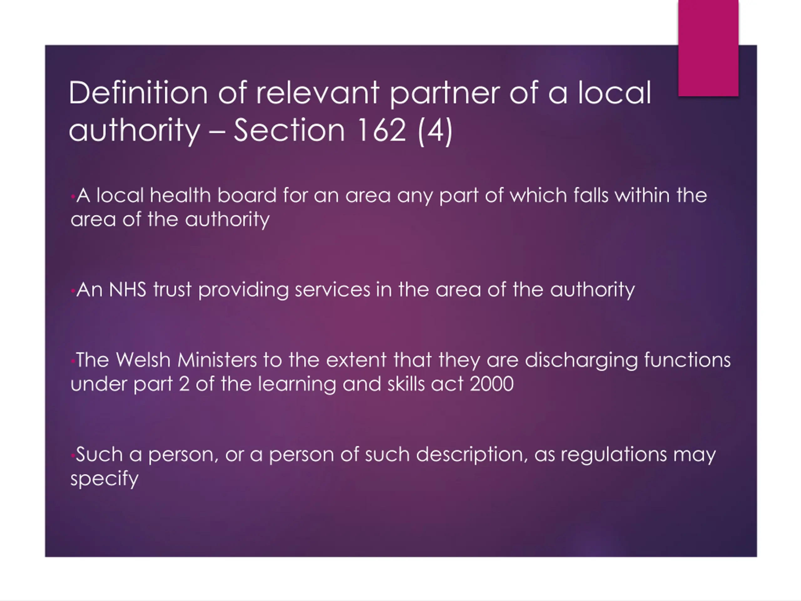 Definition of relevant partner of a local authority Section 162 (4) A local health board for an area any part of which falls within the area of the authority An NHS trust providing services in the area of the authority The Welsh Ministers to the extent that they are discharging functions under part 2 of the learning and skills act 2000 Such a person, or a person of such description, as regulations may specify