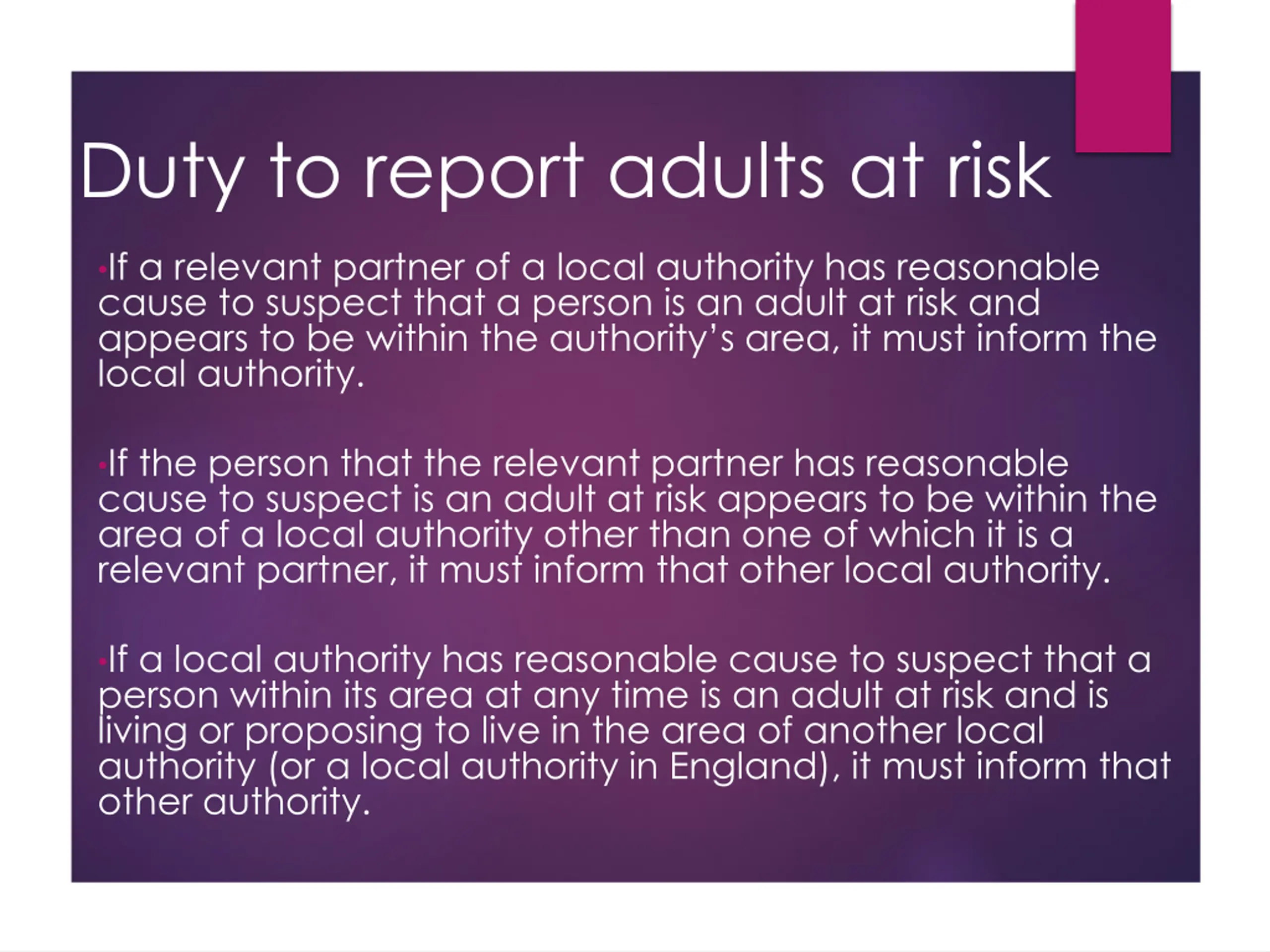 Duty to report adults at risk If a relevant partner of a local authority has reasonable cause to suspect that a person is an adult at risk and appears to be within the authority s area, it must inform the local authority. If the person that the relevant partner has reasonable cause to suspect is an adult at risk appears to be within the area of a local authority other than one of which it is a relevant partner, it must inform that other local authority. If a local authority has reasonable cause to suspect that a person within its area at any time is an adult at risk and is living or proposing to live in the area of another local authority (or a local authority in England), it must inform that other authority.