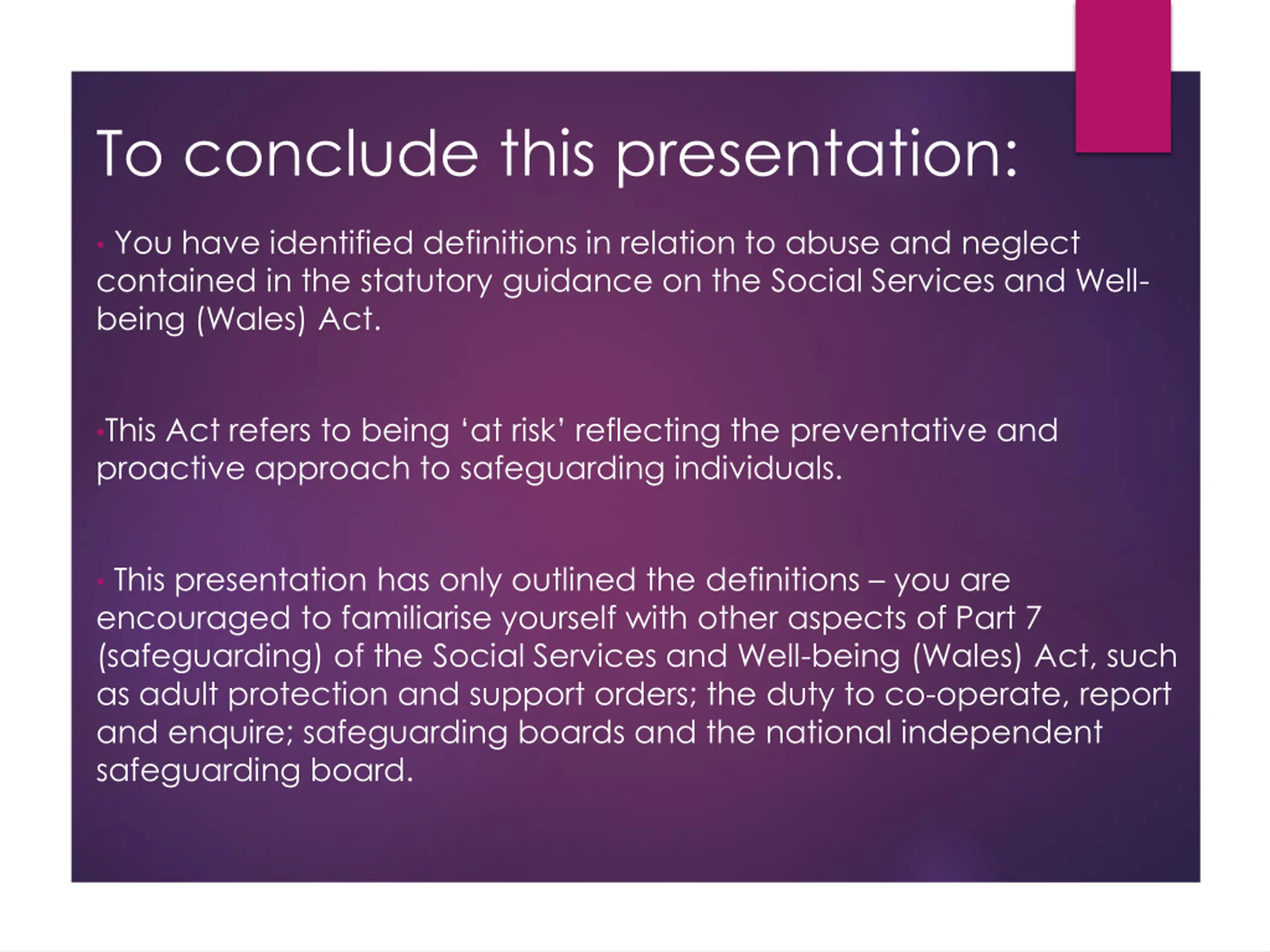 To conclude this presentation: You have identified definitions in relation to abuse and neglect contained in the statutory guidance on the Social Services and Well- being (Wales) Act. This Act refers to being at risk reflecting the preventative and proactive approach to safeguarding individuals. This presentation has only outlined the definitions you are encouraged to familiarise yourself with other aspects of Part 7 (safeguarding) of the Social Services and Well-being (Wales) Act, such as adult protection and support orders; the duty to co-operate, report and enquire; safeguarding boards and the national independent safeguarding board.