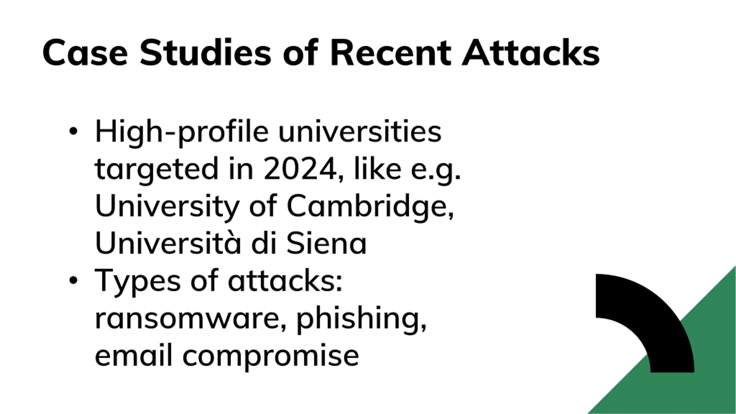 Case Studies of Recent Attacks High-profile universities targeted in 2024, like e.g. University of Cambridge, Universit di Siena Types of attacks: ransomware, phishing, email compromise