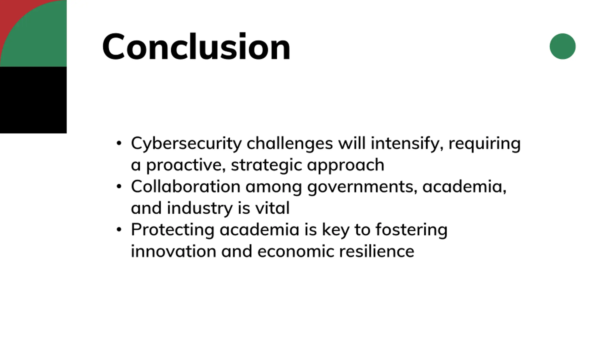 Conclusion Cybersecurity challenges will intensify, requiring a proactive, strategic approach Collaboration among governments, academia, and industry is vital Protecting academia is key to fostering innovation and economic resilience