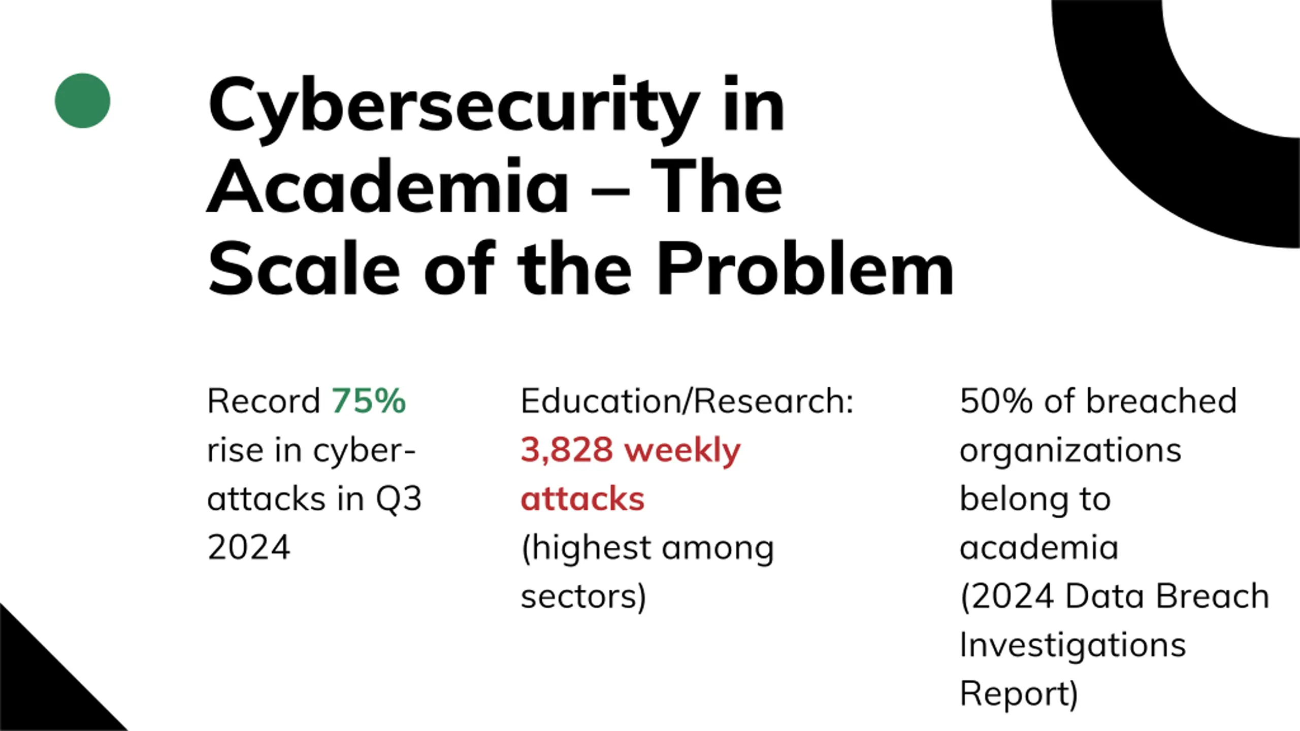Cybersecurity in Academia The Scale of the Problem Record 75% rise in cyber- attacks in Q3 2024 Education/Research: 3,828 weekly attacks (highest among sectors) 50% of breached organizations belong to academia (2024 Data Breach Investigations Report)