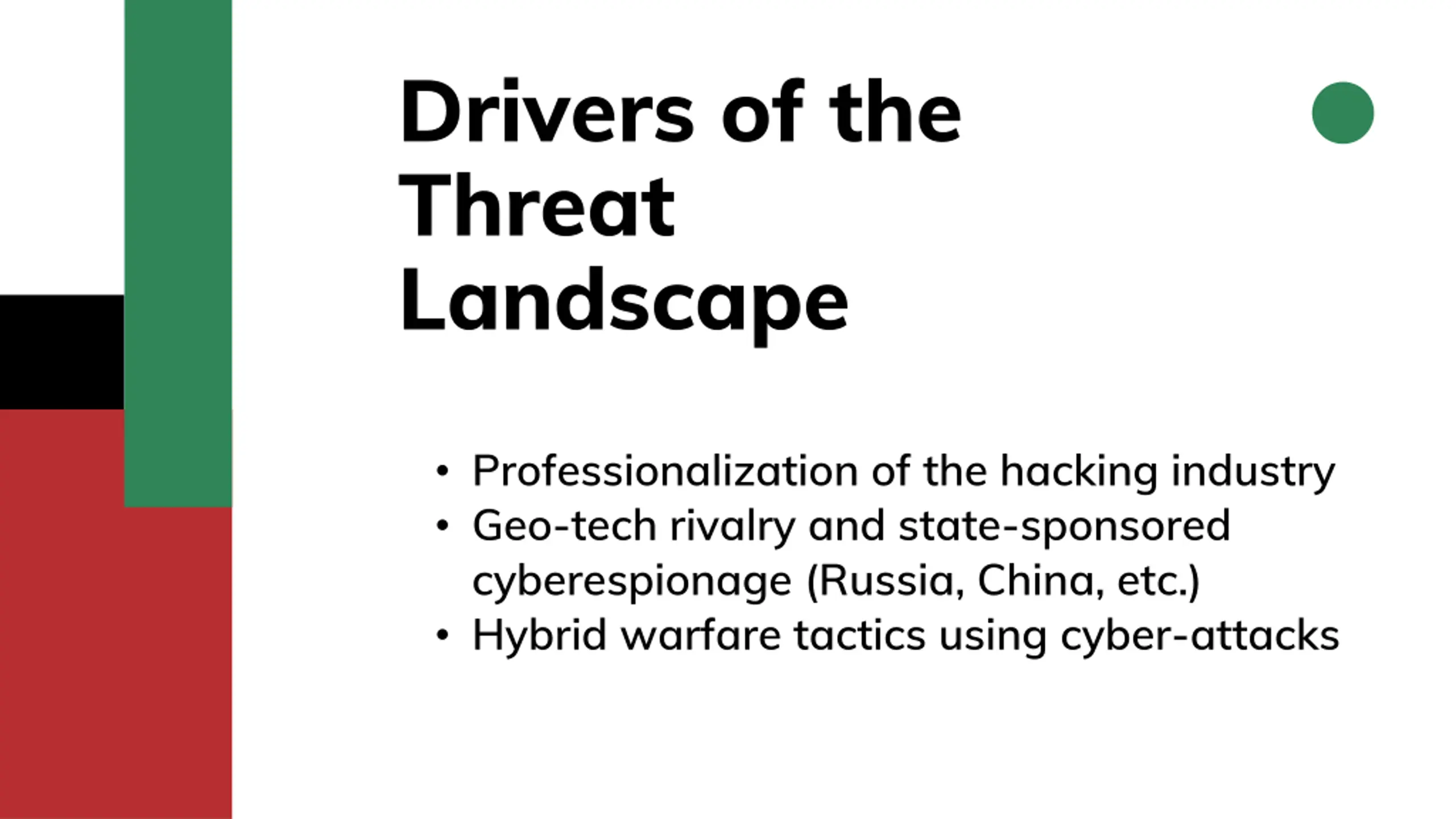 Drivers of the Threat Landscape Professionalization of the hacking industry Geo-tech rivalry and state-sponsored cyberespionage (Russia, China, etc.) Hybrid warfare tactics using cyber-attacks