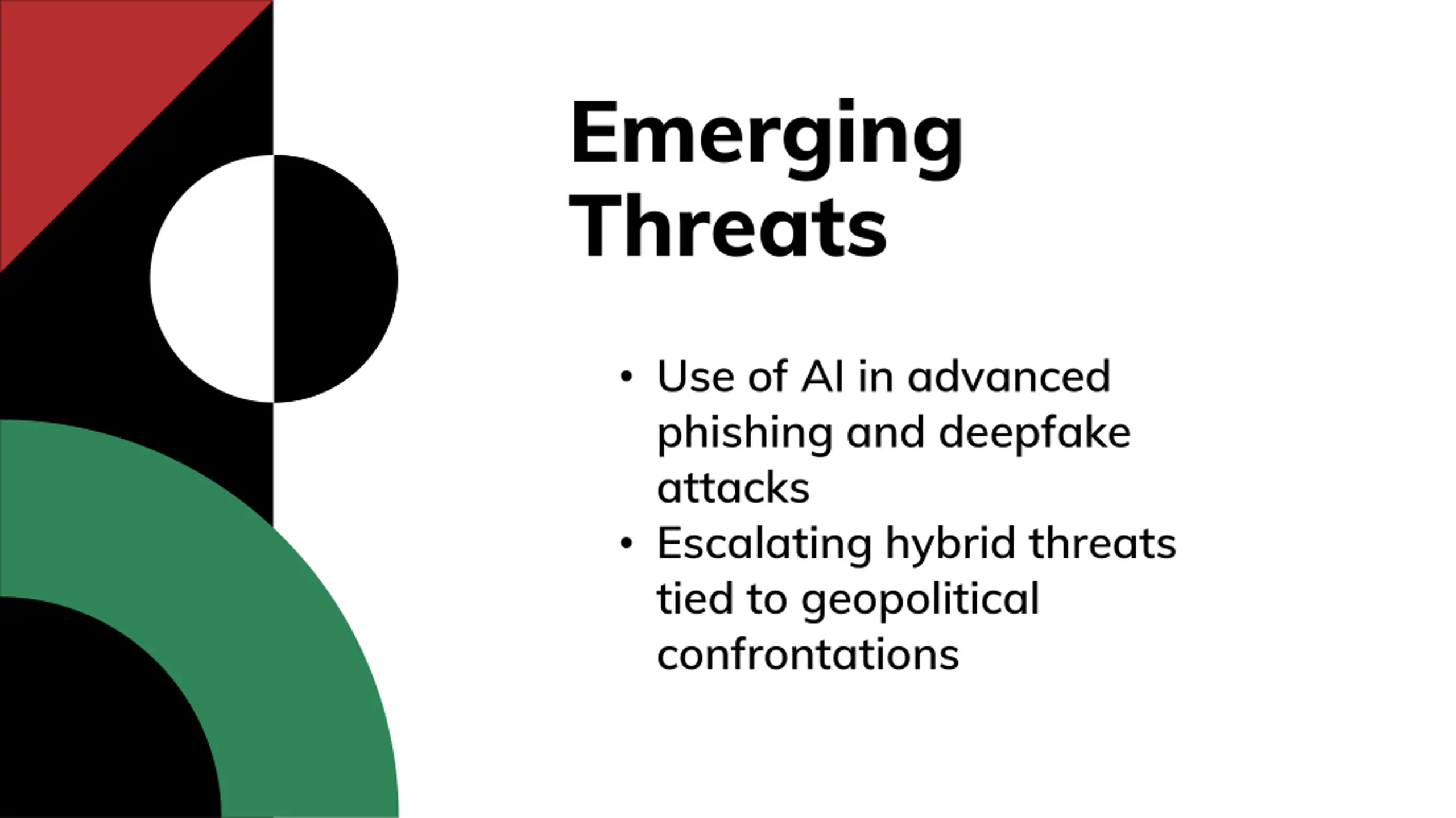 Emerging Threats Use of AI in advanced phishing and deepfake attacks Escalating hybrid threats tied to geopolitical confrontations