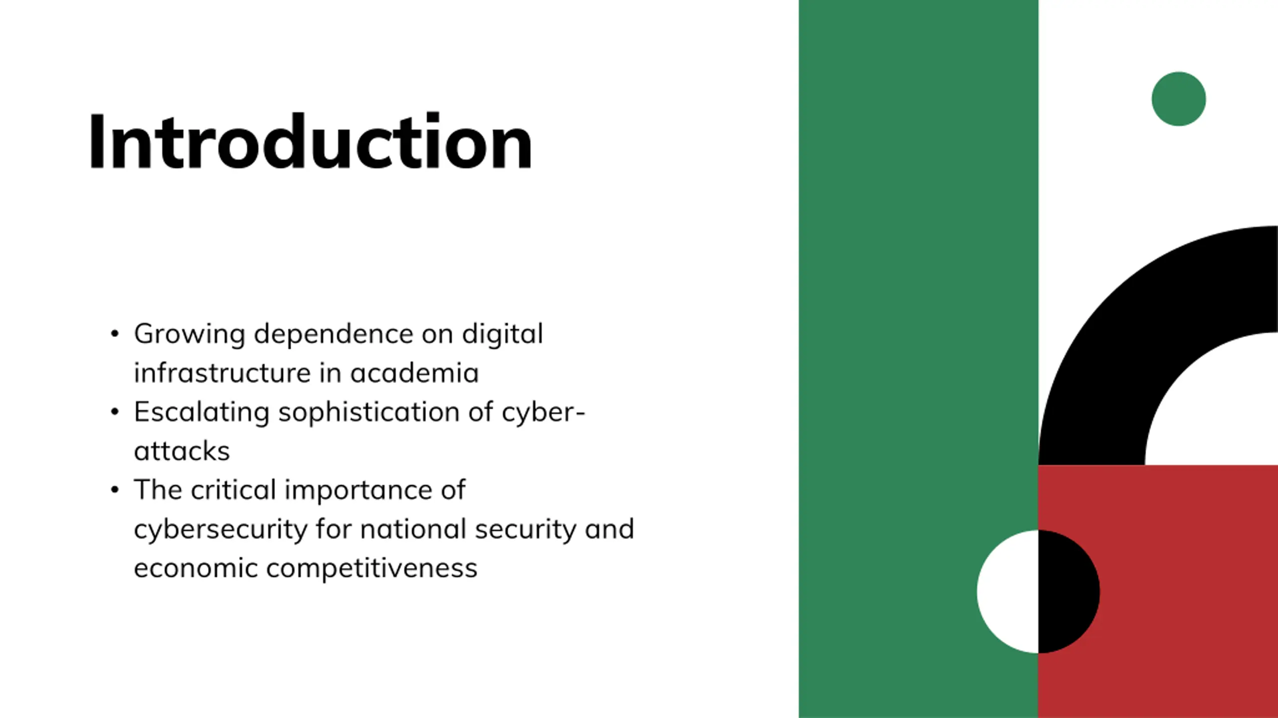 Introduction Growing dependence on digital infrastructure in academia Escalating sophistication of cyber- attacks The critical importance of cybersecurity for national security and economic competitiveness