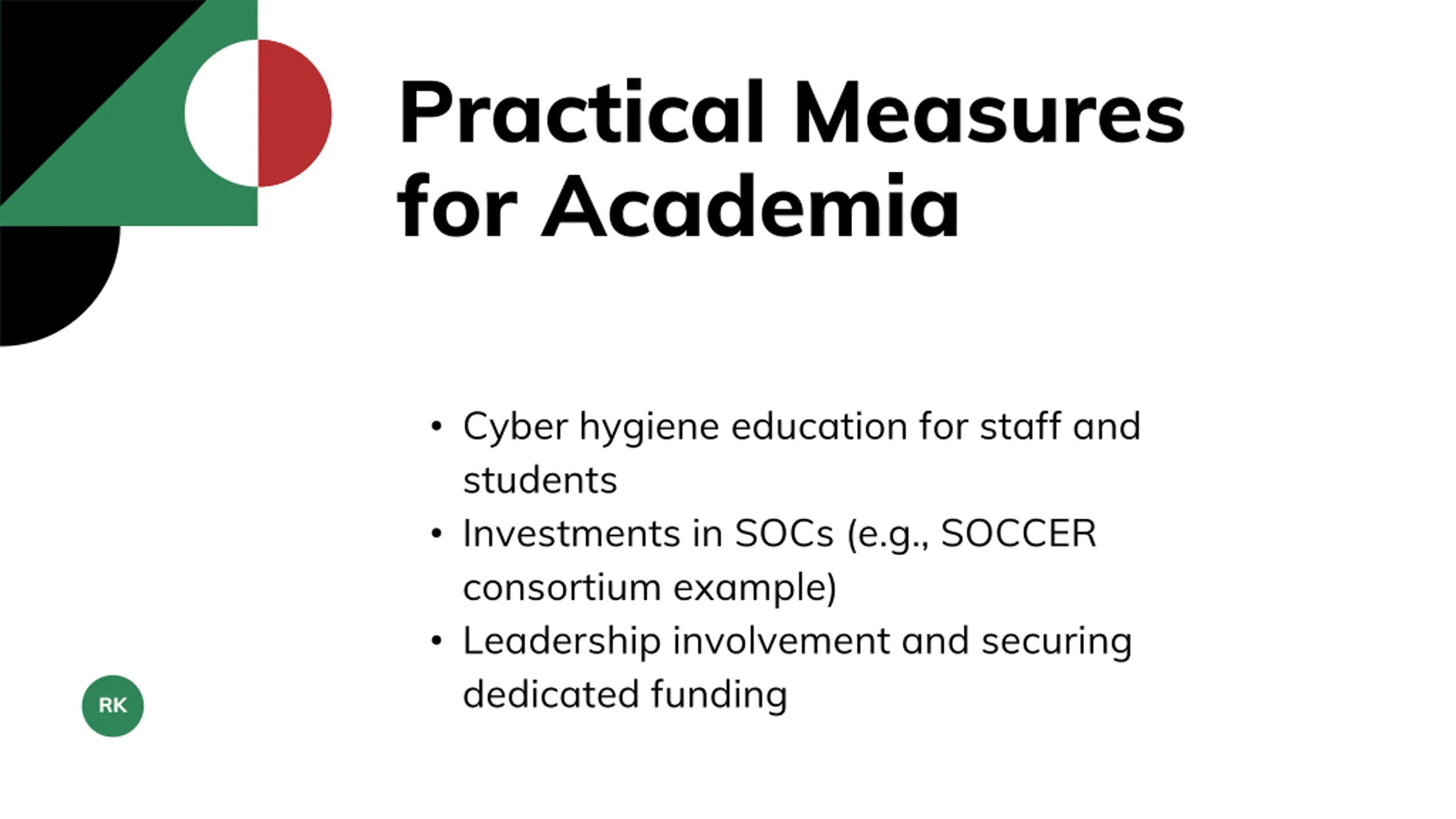 Practical Measures for Academia Cyber hygiene education for staff and students Investments in SOCs (e.g., SOCCER consortium example) Leadership involvement and securing dedicated funding RK