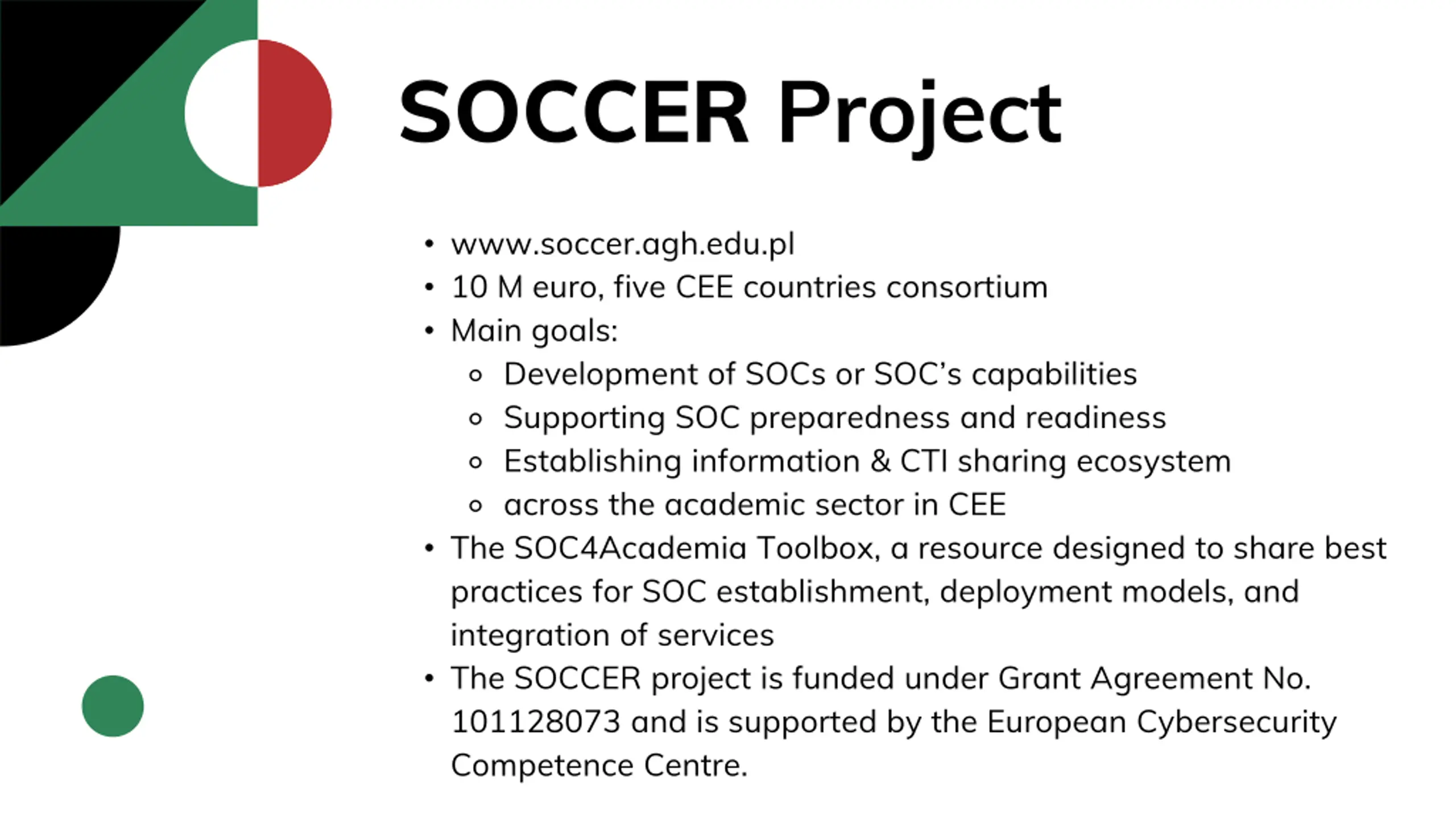 SOCCER Project www.soccer.agh.edu.pl 10 M euro, five CEE countries consortium Main goals: Development of SOCs or SOC s capabilities Supporting SOC preparedness and readiness Establishing information & CTI sharing ecosystem across the academic sector in CEE The SOC4Academia Toolbox, a resource designed to share best practices for SOC establishment, deployment models, and integration of services The SOCCER project is funded under Grant Agreement No. 101128073 and is supported by the European Cybersecurity Competence Centre.