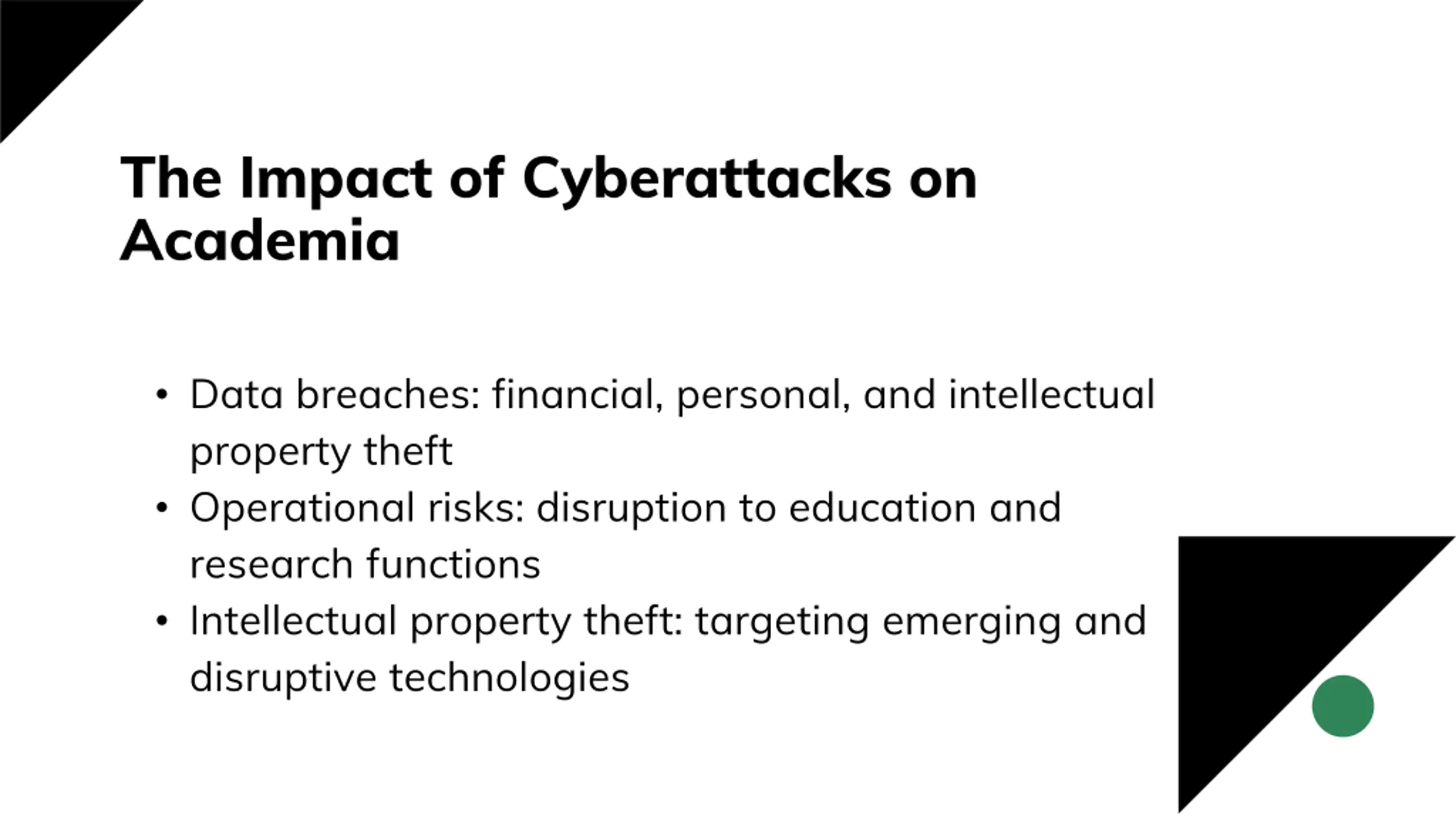 The Impact of Cyberattacks on Academia Data breaches: financial, personal, and intellectual property theft Operational risks: disruption to education and research functions Intellectual property theft: targeting emerging and disruptive technologies