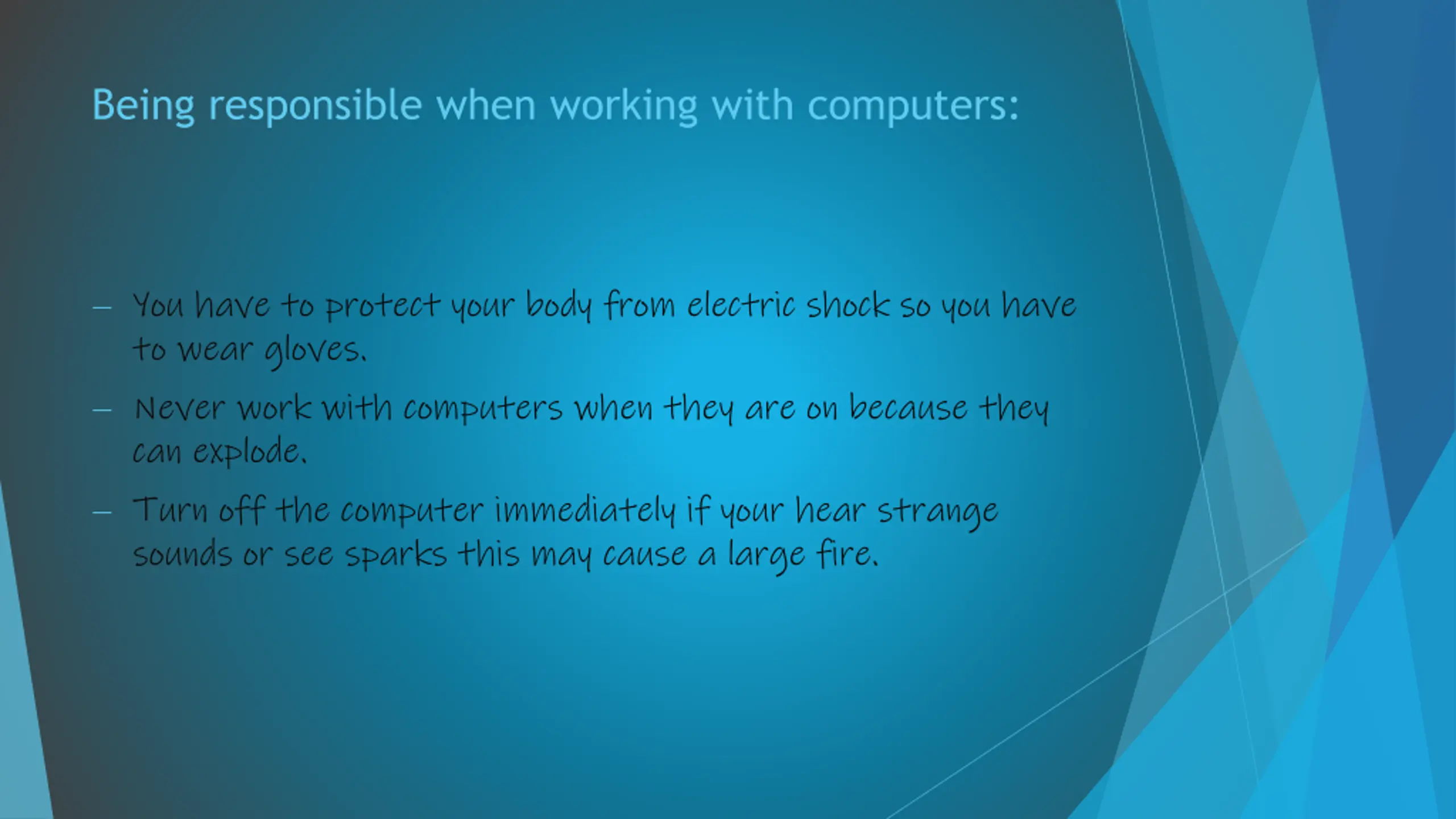 Being responsible when working with computers: You have to protect your body from electric shock so you have to wear gloves. Never work with computers when they are on because they can explode. Turn off the computer immediately if your hear strange sounds or see sparks this may cause a large fire.