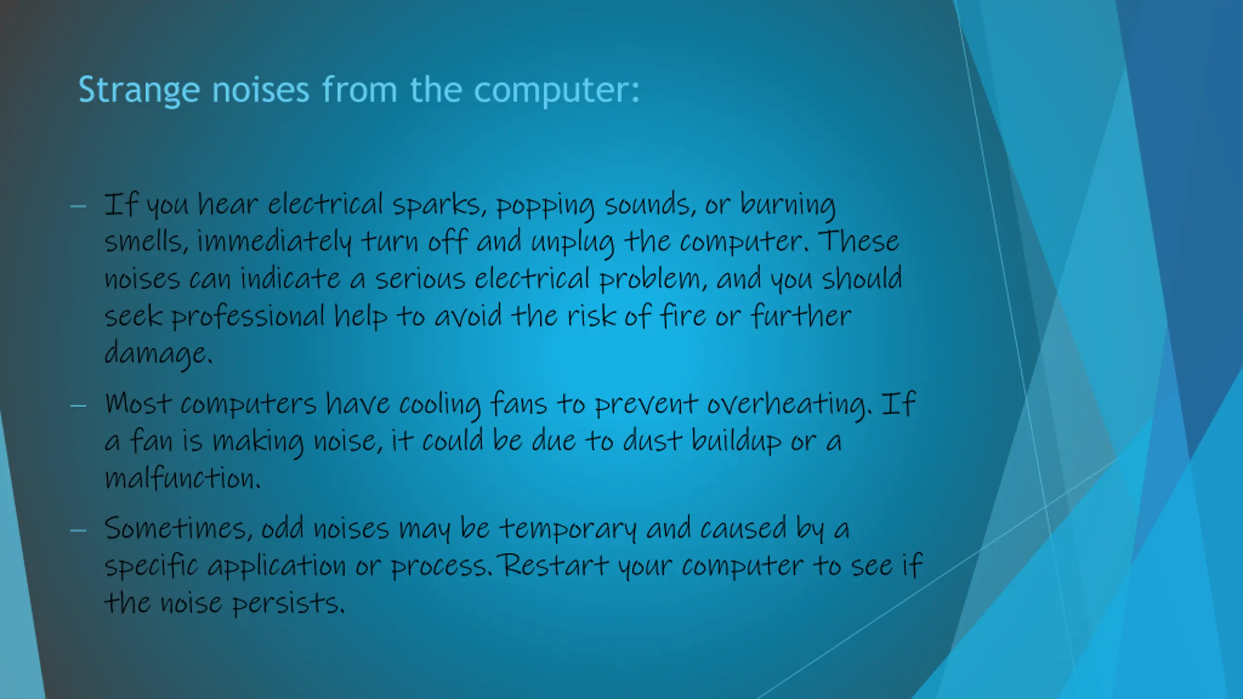 Strange noises from the computer: If you hear electrical sparks, popping sounds, or burning smells, immediately turn off and unplug the computer. These noises can indicate a serious electrical problem, and you should seek professional help to avoid the risk of fire or further damage. Most computers have cooling fans to prevent overheating. If a fan is making noise, it could be due to dust buildup or a malfunction. Sometimes, odd noises may be temporary and caused by a specific application or process. Restart your computer to see if the noise persists.