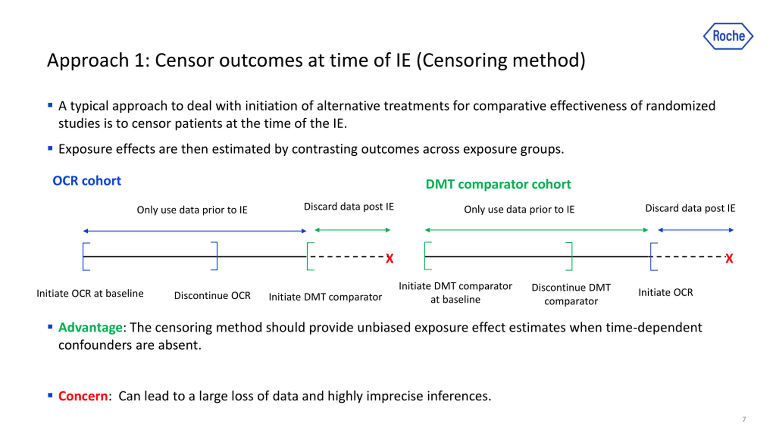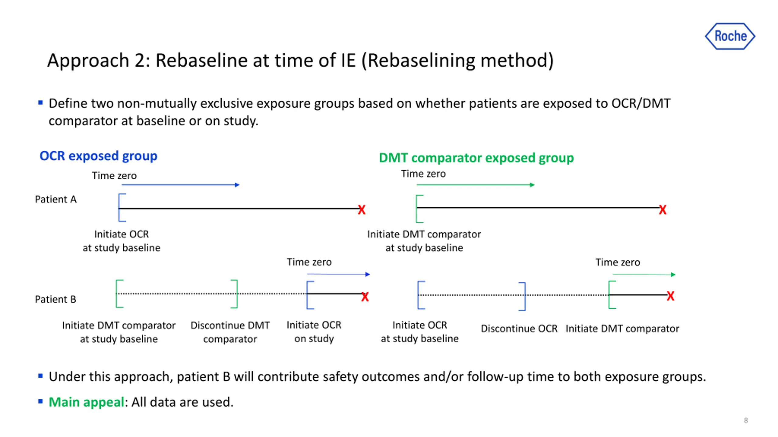 Approach 1: Censor outcomes at time of IE (Censoring method) A typical approach to deal with initiation of alternative treatments for comparative effectiveness of randomized studies is to censor patients at the time of the IE. Exposure effects are then estimated by contrasting outcomes across exposure groups. OCR cohort DMT comparator cohort Discard data post IE Discard data post IE Only use data prior to IE Only use data prior to IE X X Initiate DMT comparator at baseline Discontinue DMT comparator Initiate OCR Initiate OCR at baseline Discontinue OCR Initiate DMT comparator Advantage:The censoring method should provide unbiased exposure effect estimates when time-dependent confounders are absent. Concern: Can lead to a large loss of data and highly imprecise inferences. 7