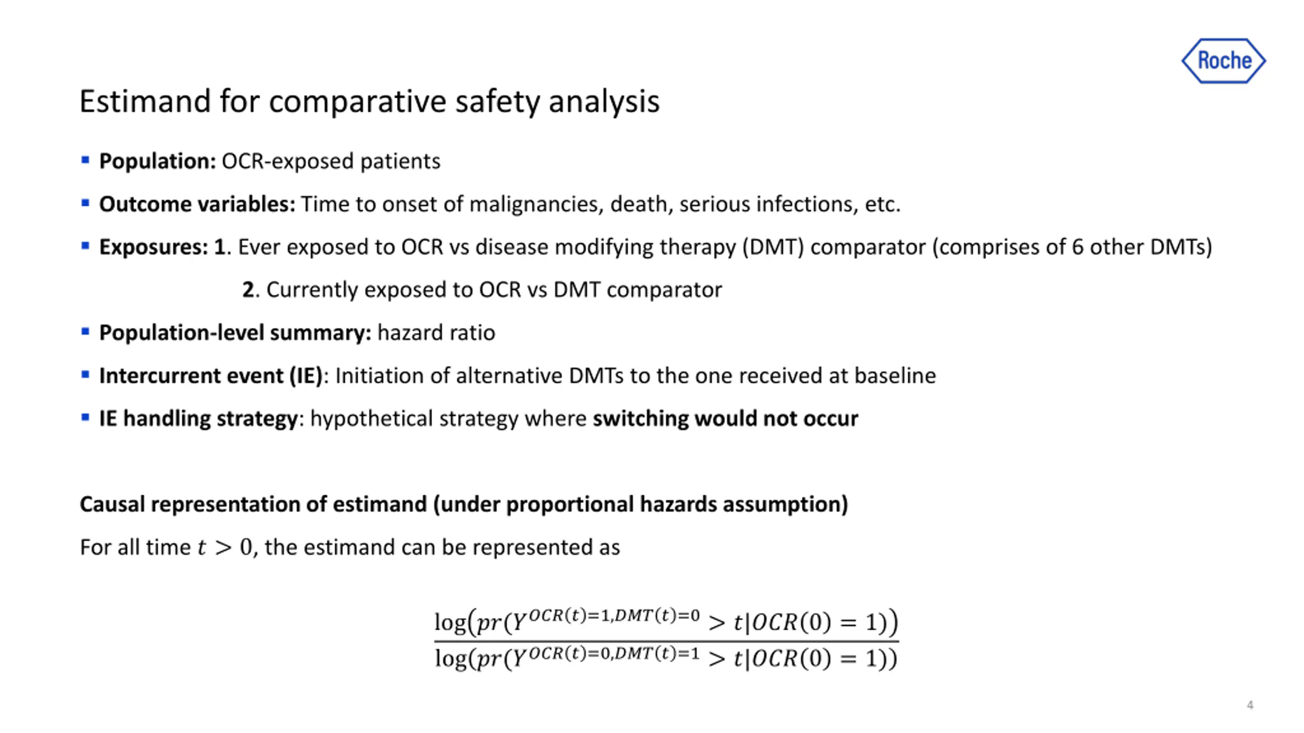 Estimand for comparative safety analysis Population: OCR-exposed patients Outcome variables: Time to onset of malignancies, death, serious infections, etc. Exposures: 1.Everexposed to OCR vs disease modifying therapy (DMT) comparator (comprises of 6 other DMTs) 2. Currentlyexposed to OCR vs DMT comparator Population-level summary: hazard ratio Intercurrent event (IE): Initiation of alternative DMTs to the one received at baseline IE handling strategy: hypothetical strategy where switching would not occur Causal representation of estimand (under proportional hazards assumption) For all time ? > 0, the estimand can be represented as log ??(???? ? =1,??? ? =0> ?|??? 0 = 1) log ??(???? ? =0,??? ? =1> ?|??? 0 = 1) 4