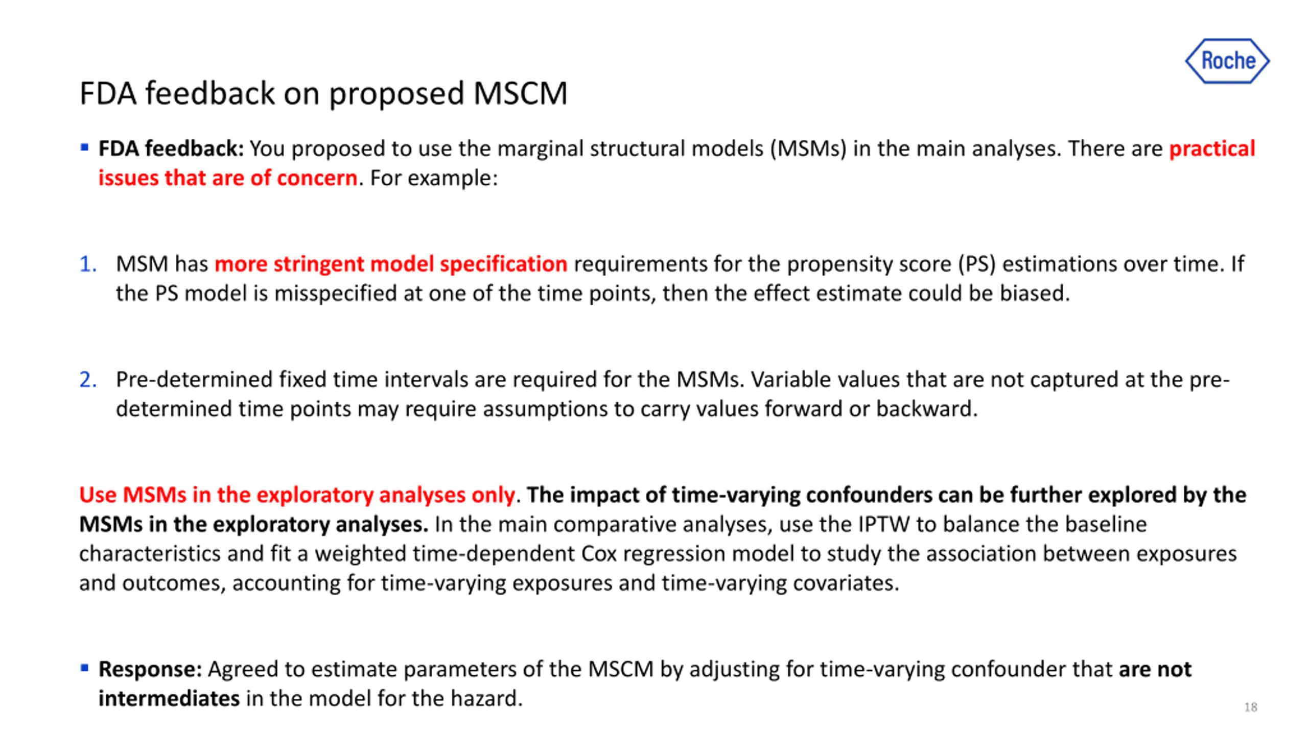 FDA feedback on proposed MSCM FDA feedback: You proposed to use the marginal structural models (MSMs) in the main analyses. There are practical issues that are of concern. For example: 1. MSM has more stringent model specification requirements for the propensity score (PS) estimations over time. If the PS model is misspecified at one of the time points, then the effect estimate could be biased. 2. Pre-determined fixed time intervals are required for the MSMs. Variable values that are not captured at the pre- determined time points may require assumptions to carry values forward or backward. Use MSMs in the exploratory analyses only. The impact of time-varying confounders can be further explored by the MSMs in the exploratory analyses. In the main comparative analyses, use the IPTW to balance the baseline characteristics and fit a weighted time-dependent Cox regression model to study the association between exposures and outcomes, accounting for time-varying exposures and time-varying covariates. Response: Agreed to estimate parameters of the MSCM by adjusting for time-varying confounder that are not intermediates in the model for the hazard. 18