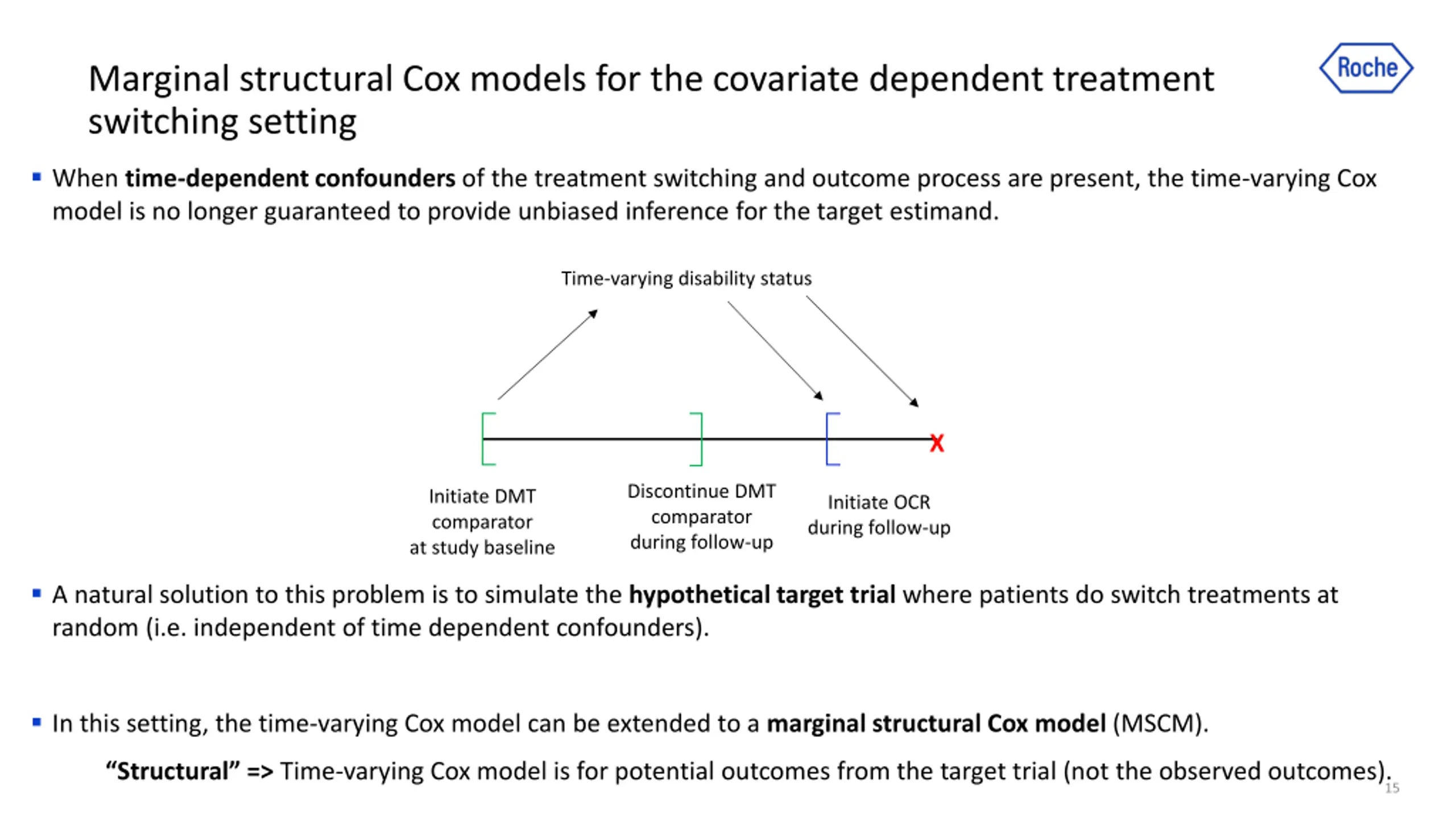 Marginal structural Cox models for the covariate dependent treatment switching setting When time-dependent confounders of the treatment switching and outcome process are present, the time-varying Cox model is no longer guaranteed to provide unbiased inference for the target estimand. Time-varying disability status X Discontinue DMT comparator during follow-up Initiate DMT comparator at study baseline Initiate OCR during follow-up A natural solution to this problem is to simulate the hypotheticaltarget trial where patients do switch treatments at random (i.e. independent of time dependent confounders). In this setting, the time-varying Cox model can be extended to a marginal structural Cox model (MSCM). Structural => Time-varying Cox model is for potential outcomes from the target trial (not the observed outcomes). 15
