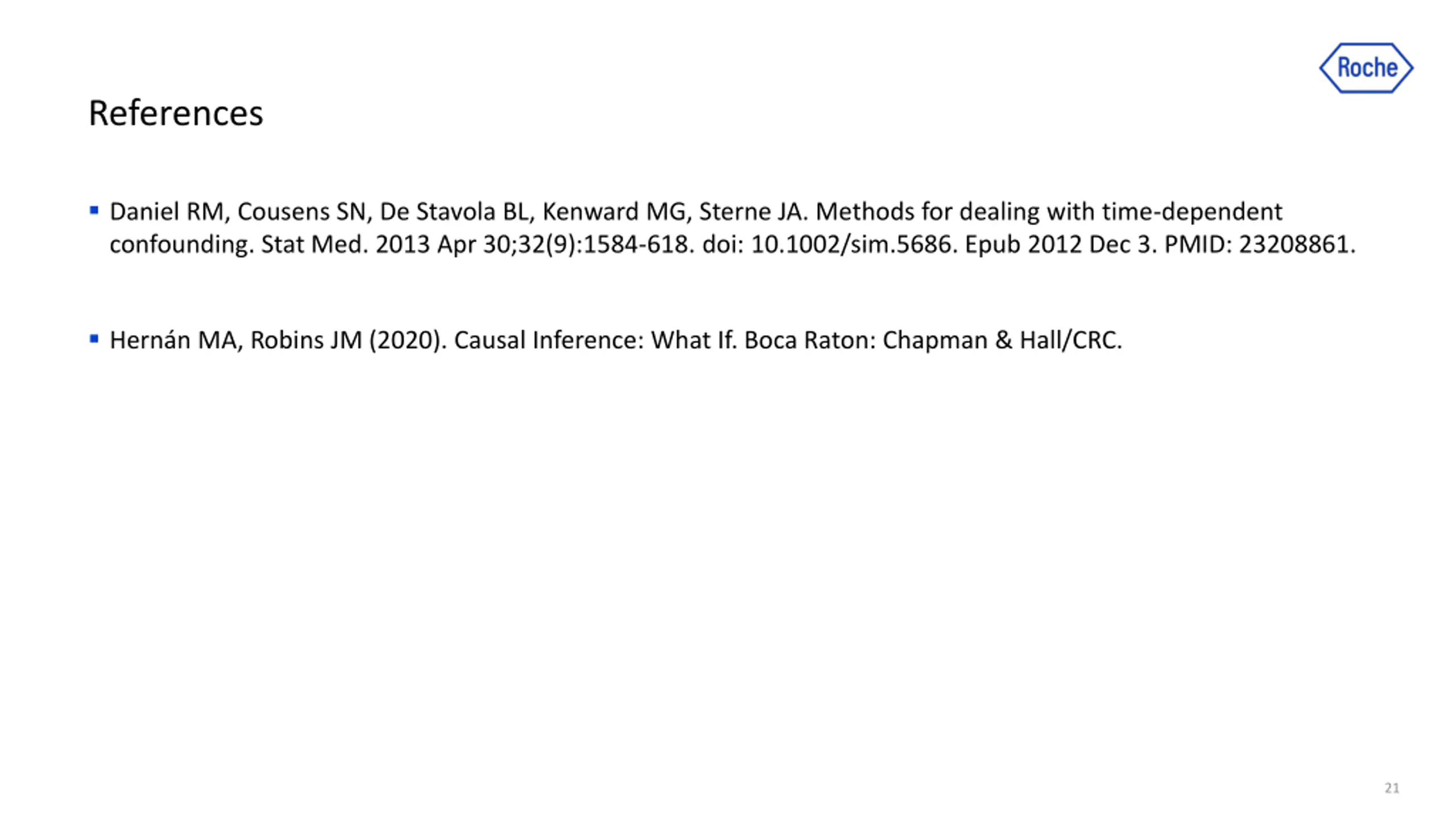 References Daniel RM, Cousens SN, De Stavola BL, Kenward MG, Sterne JA. Methods for dealing with time-dependent confounding. Stat Med. 2013 Apr 30;32(9):1584-618. doi: 10.1002/sim.5686. Epub 2012 Dec 3. PMID: 23208861. Hern n MA, Robins JM (2020). Causal Inference: What If. Boca Raton: Chapman & Hall/CRC. 21