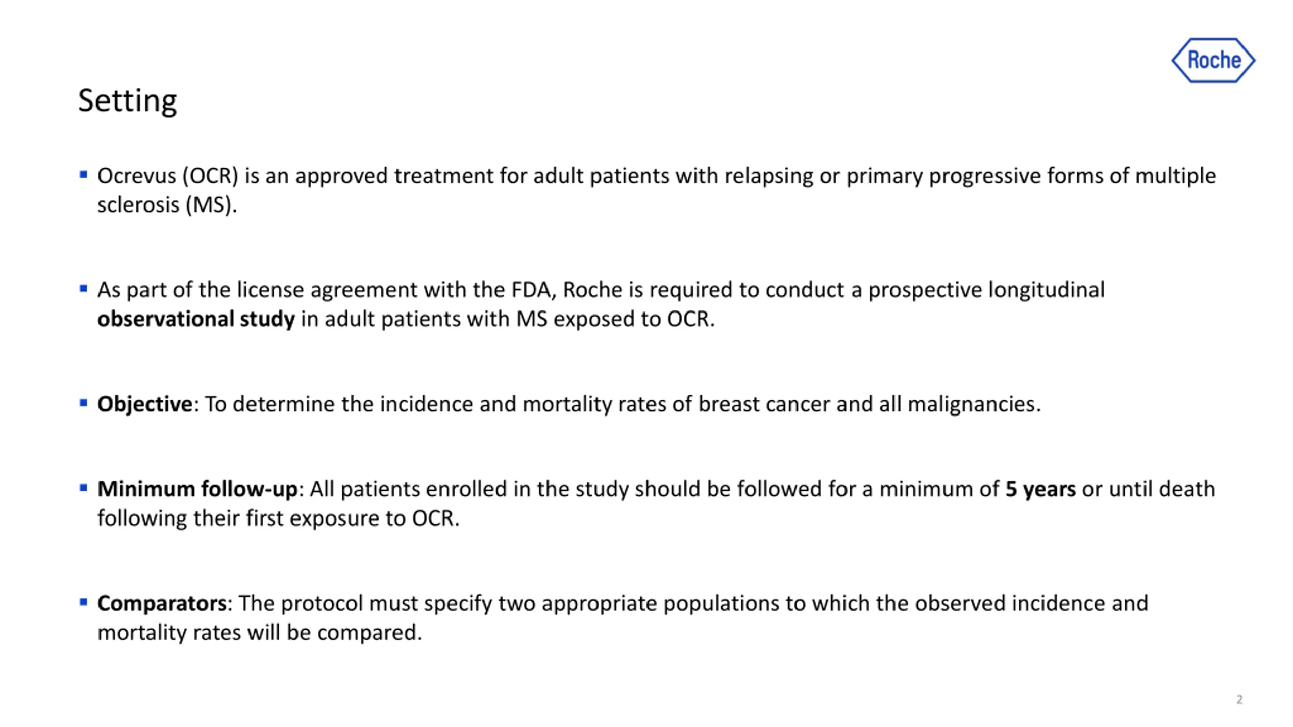 Setting Ocrevus (OCR) is an approved treatment for adult patients with relapsing or primary progressive forms of multiple sclerosis (MS). As part of the license agreement with the FDA, Roche is required to conduct a prospective longitudinal observational study in adult patients with MS exposed to OCR. Objective: To determine the incidence and mortality rates of breast cancer and all malignancies. Minimum follow-up: All patients enrolled in the study should be followed for a minimum of 5 years or until death following their first exposure to OCR. Comparators: The protocol must specify two appropriate populations to which the observed incidence and mortality rates will be compared. 2
