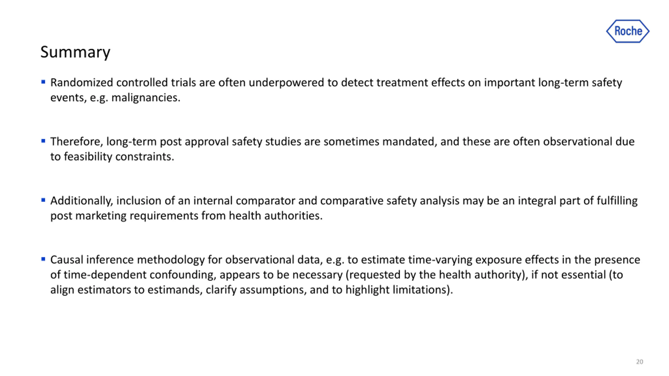 Summary Randomized controlled trials are often underpowered to detect treatment effects on important long-term safety events, e.g. malignancies. Therefore, long-term post approval safety studies are sometimes mandated, and these are often observational due to feasibility constraints. Additionally, inclusion of an internal comparator and comparative safety analysis may be an integral part of fulfilling post marketing requirements from health authorities. Causal inference methodology for observational data, e.g. to estimate time-varying exposure effects in the presence of time-dependent confounding, appears to be necessary (requested by the health authority), if not essential (to align estimators to estimands, clarify assumptions, and to highlight limitations). 20