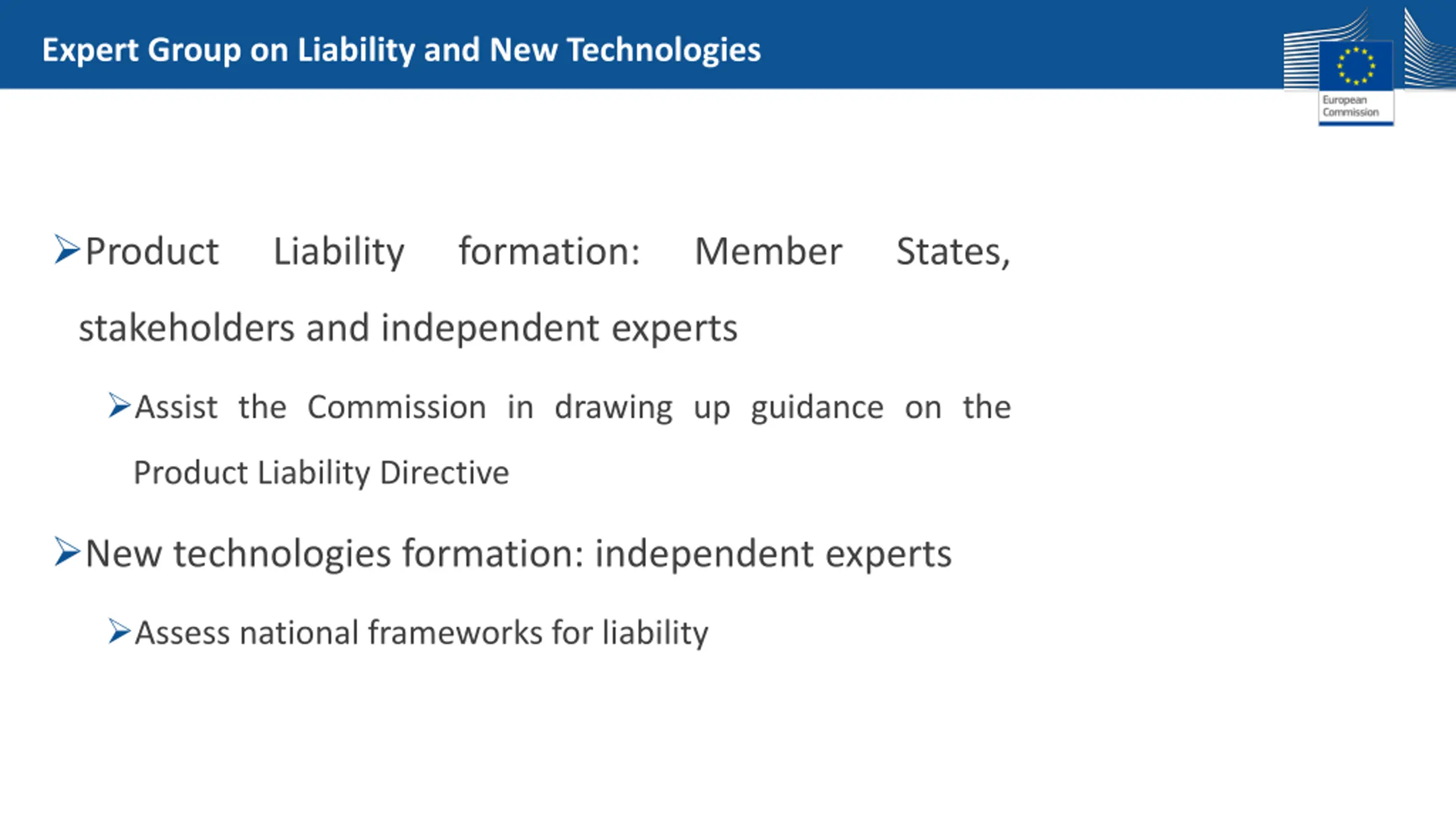 Expert Group on Liability and New Technologies Product Liability formation: Member States, stakeholders and independent experts Assist the Commission in drawing up guidance on the Product Liability Directive New technologies formation: independent experts Assess national frameworks for liability