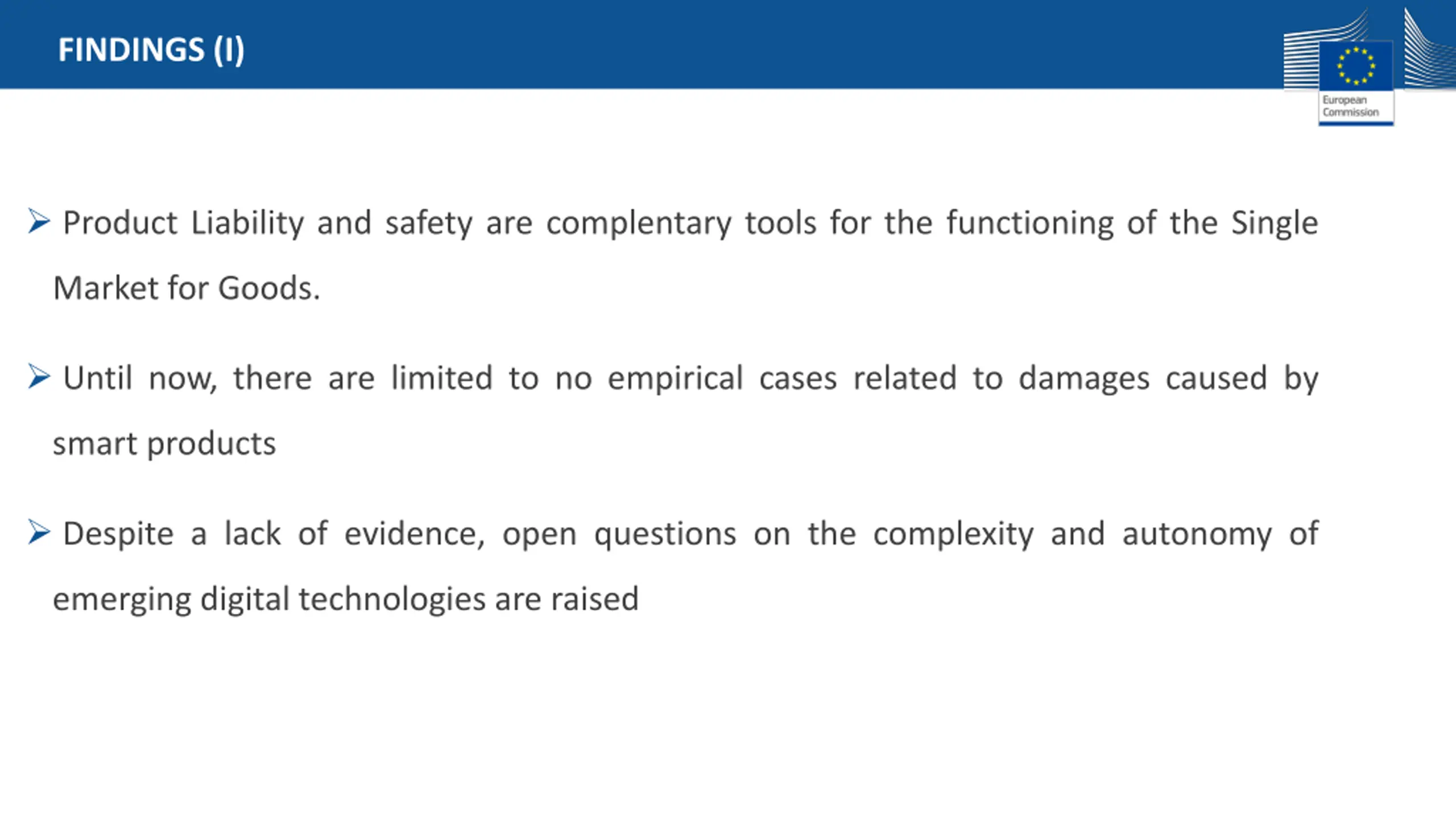 FINDINGS (I) Product Liability and safety are complentary tools for the functioning of the Single Market for Goods. Until now, there are limited to no empirical cases related to damages caused by smart products Despite a lack of evidence, open questions on the complexity and autonomy of emerging digital technologies are raised