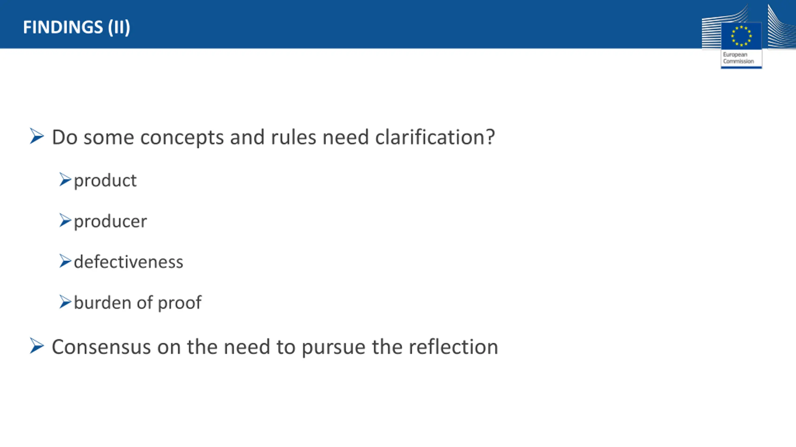 FINDINGS (II) Do some concepts and rules need clarification? product producer defectiveness burden of proof Consensus on the need to pursue the reflection