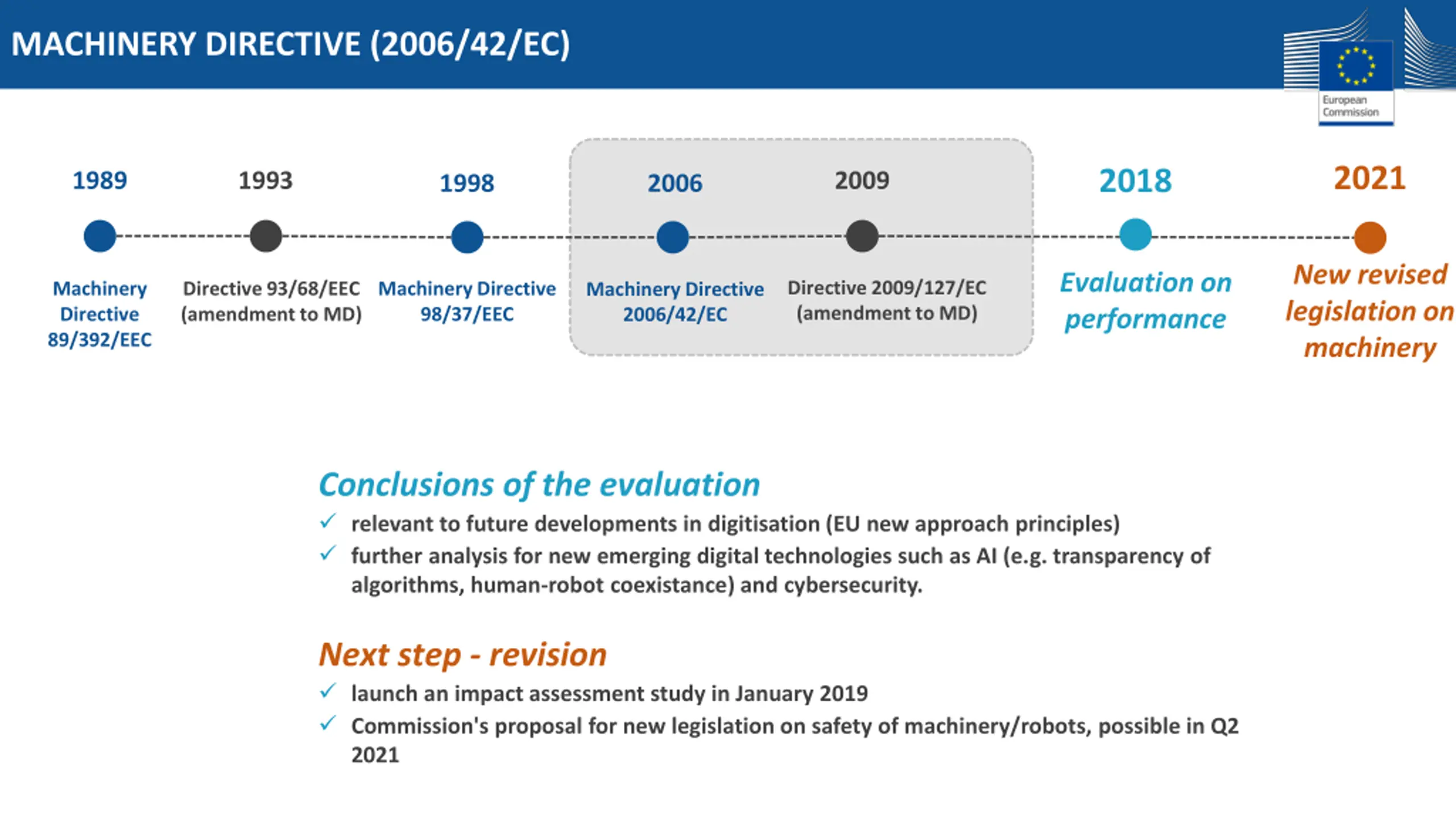 MACHINERY DIRECTIVE (2006/42/EC) 2021 2018 1989 1993 2009 1998 2006 New revised legislation on machinery Evaluation on performance Directive 2009/127/EC (amendment to MD) Machinery Directive 89/392/EEC Directive 93/68/EEC (amendment to MD) Machinery Directive 98/37/EEC Machinery Directive 2006/42/EC Conclusions of the evaluation relevant to future developments in digitisation (EU new approach principles) further analysis for new emerging digital technologies such as AI (e.g. transparency of algorithms, human-robot coexistance) and cybersecurity. Next step - revision launch an impact assessment study in January 2019 Commission's proposal for new legislation on safety of machinery/robots, possible in Q2 2021