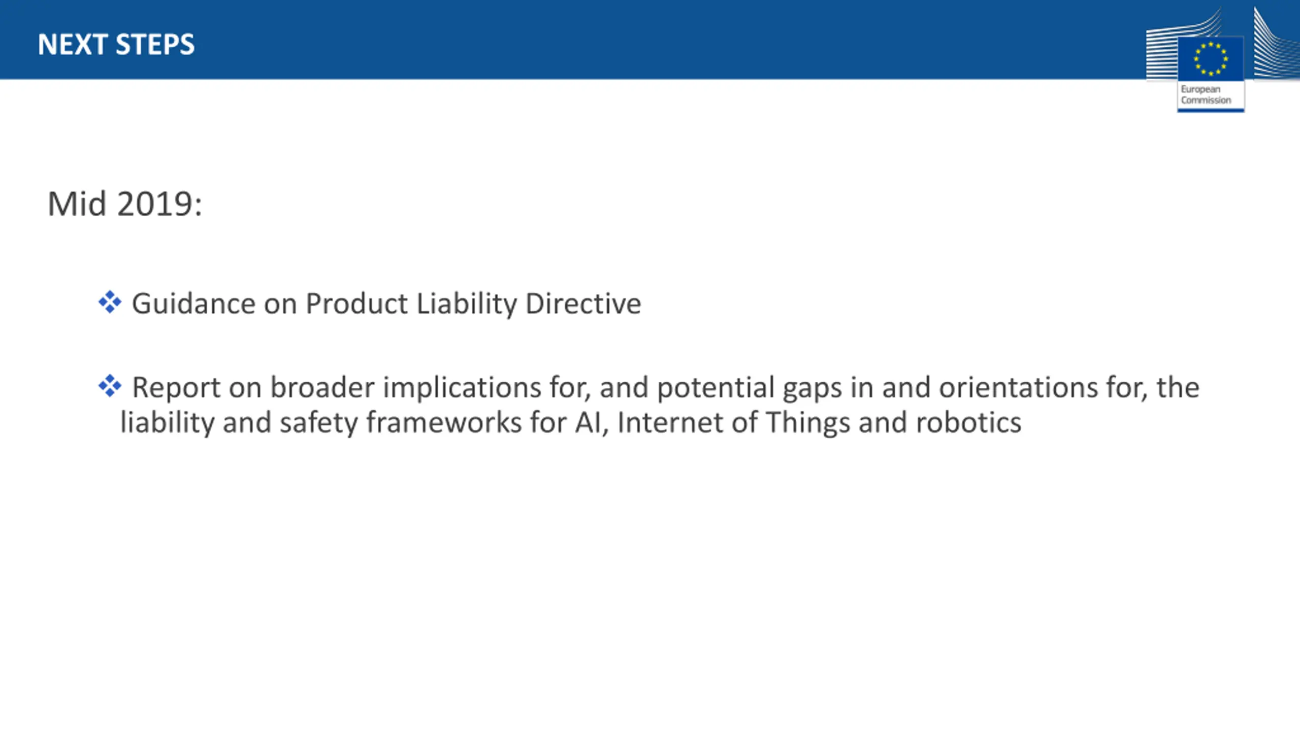 NEXT STEPS Mid 2019: Guidance on Product Liability Directive Report on broader implications for, and potential gaps in and orientations for, the liability and safety frameworks for AI, Internet of Things and robotics