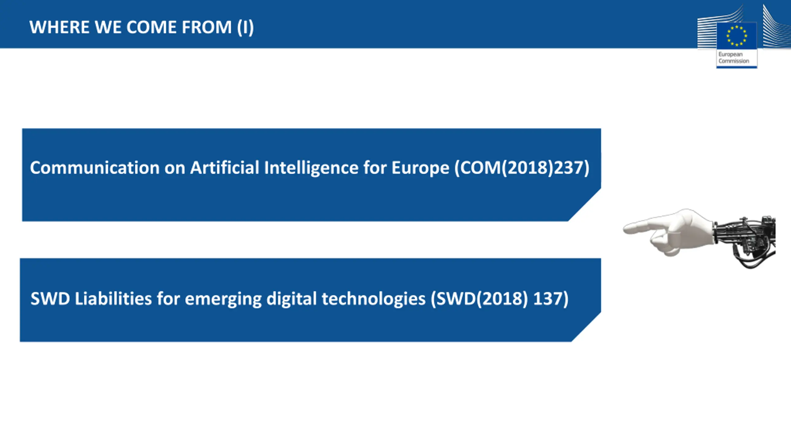 WHERE WE COME FROM (I) Communication on Artificial Intelligence for Europe (COM(2018)237) SWD Liabilities for emerging digital technologies (SWD(2018) 137)