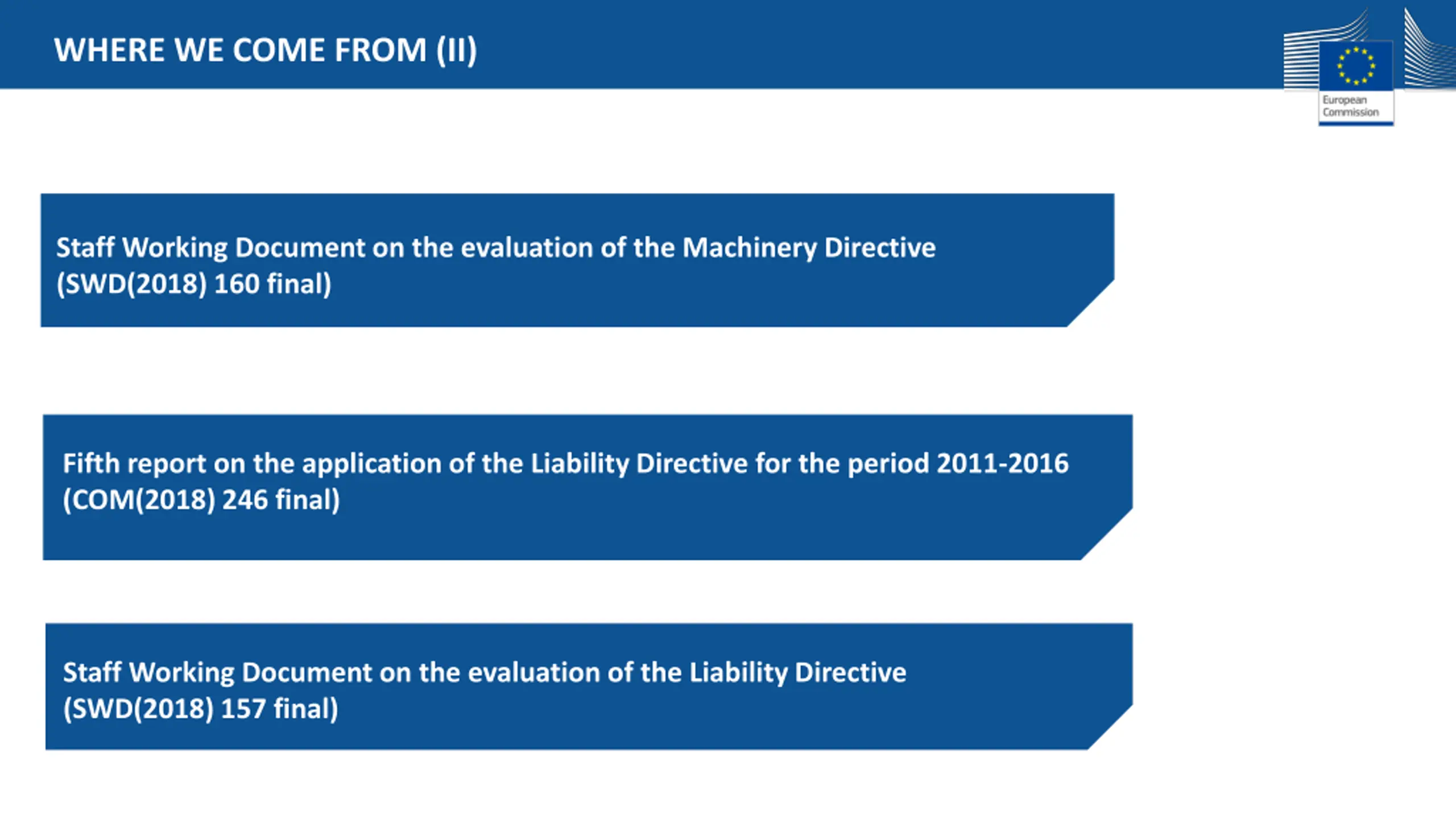 WHERE WE COME FROM (II) Staff Working Document on the evaluation of the Machinery Directive (SWD(2018) 160 final) Fifth report on the application of the Liability Directive for the period 2011-2016 (COM(2018) 246 final) Staff Working Document on the evaluation of the Liability Directive (SWD(2018) 157 final)