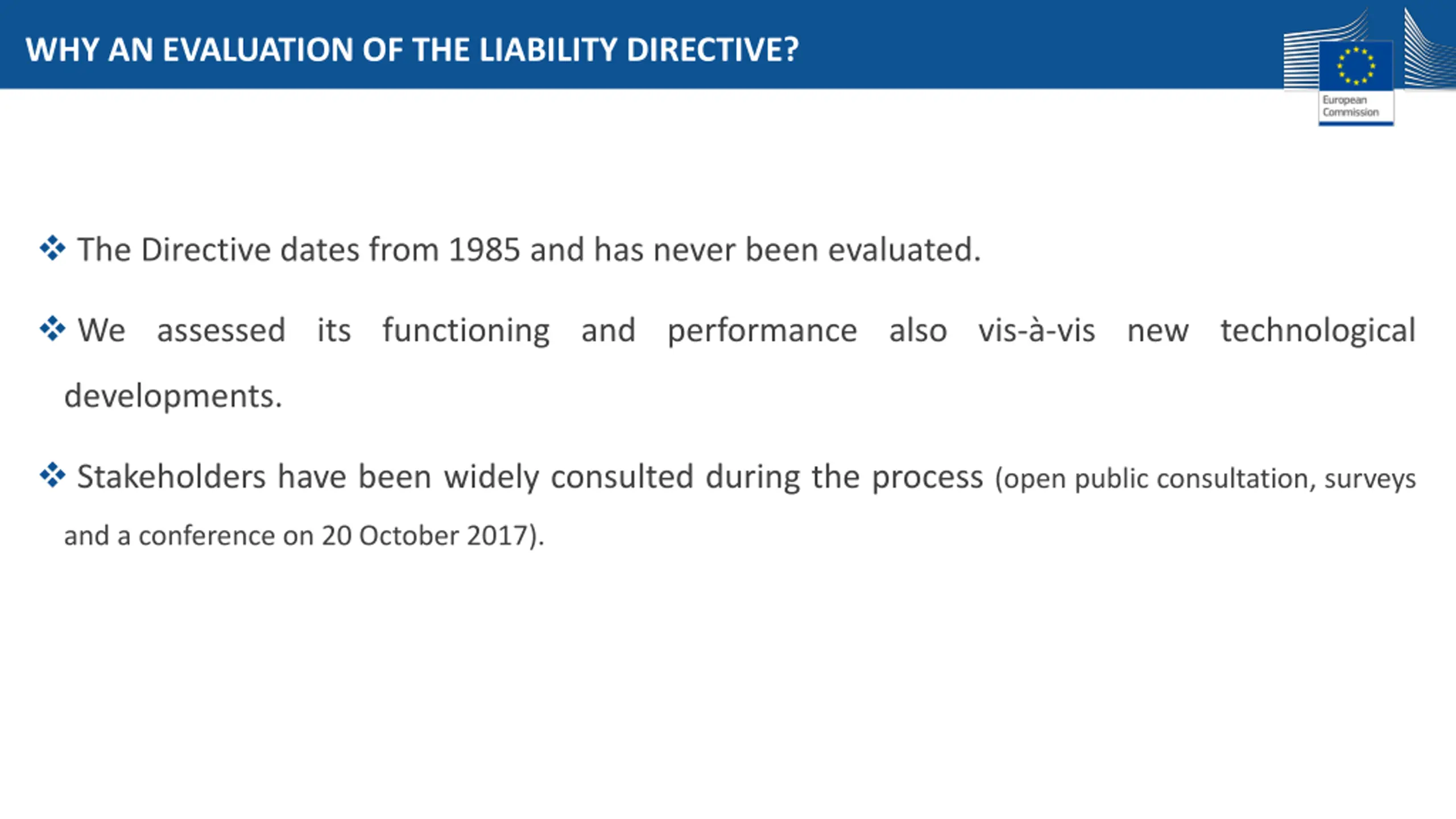 WHY AN EVALUATION OF THE LIABILITY DIRECTIVE? The Directive dates from 1985 and has never been evaluated. We assessed its functioning and performance also vis- -vis new technological developments. Stakeholders have been widely consulted during the process (open public consultation, surveys and a conference on 20 October 2017).