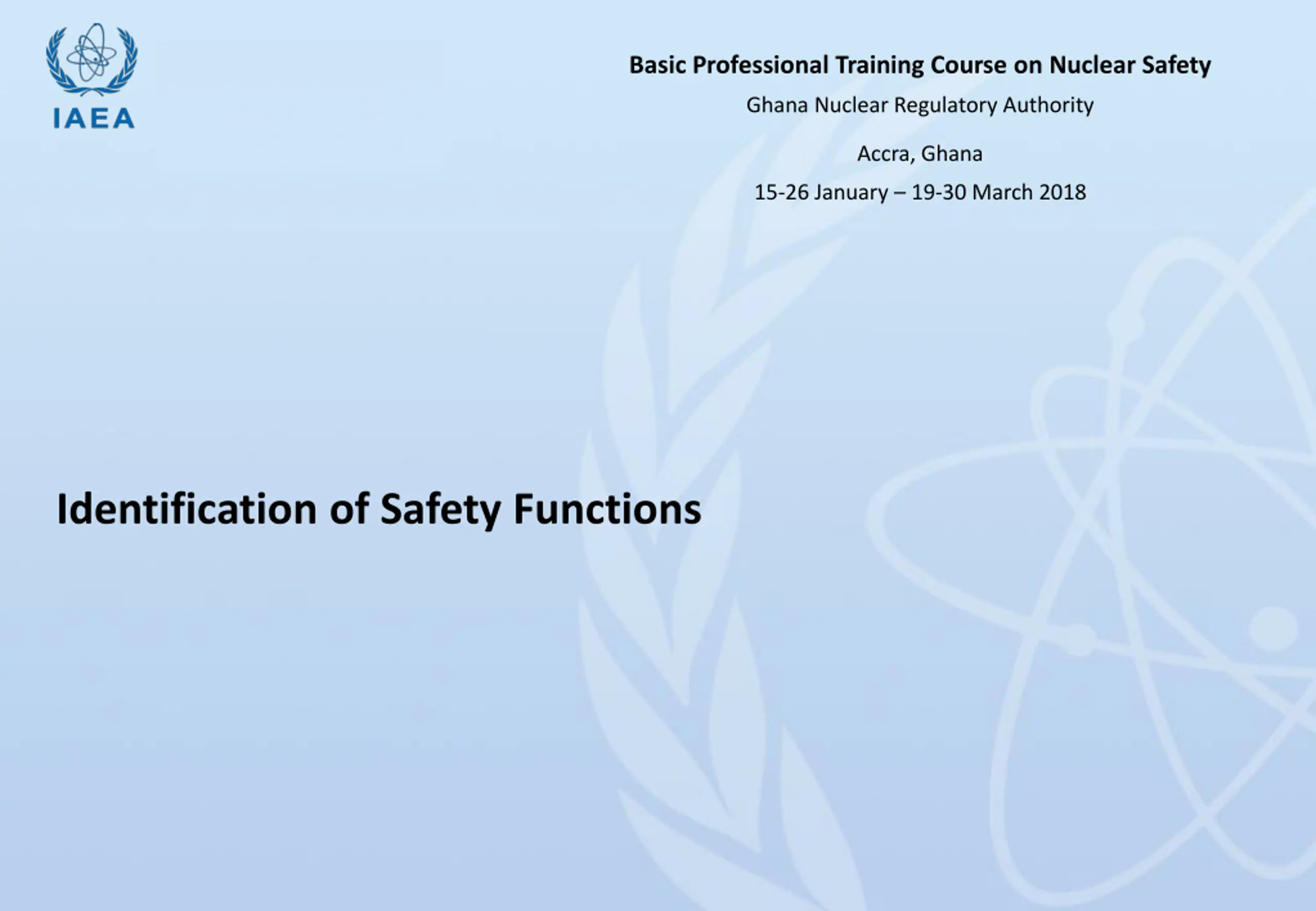 Basic Professional Training Course on Nuclear Safety Ghana Nuclear Regulatory Authority Accra, Ghana 15-26 January 19-30 March 2018 Identification of Safety Functions