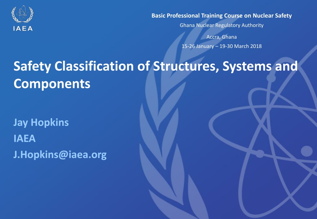 Basic Professional Training Course on Nuclear Safety Ghana Nuclear Regulatory Authority Accra, Ghana 15-26 January 19-30 March 2018 Safety Classification of Structures, Systems and Components Jay Hopkins IAEA J.Hopkins@iaea.org