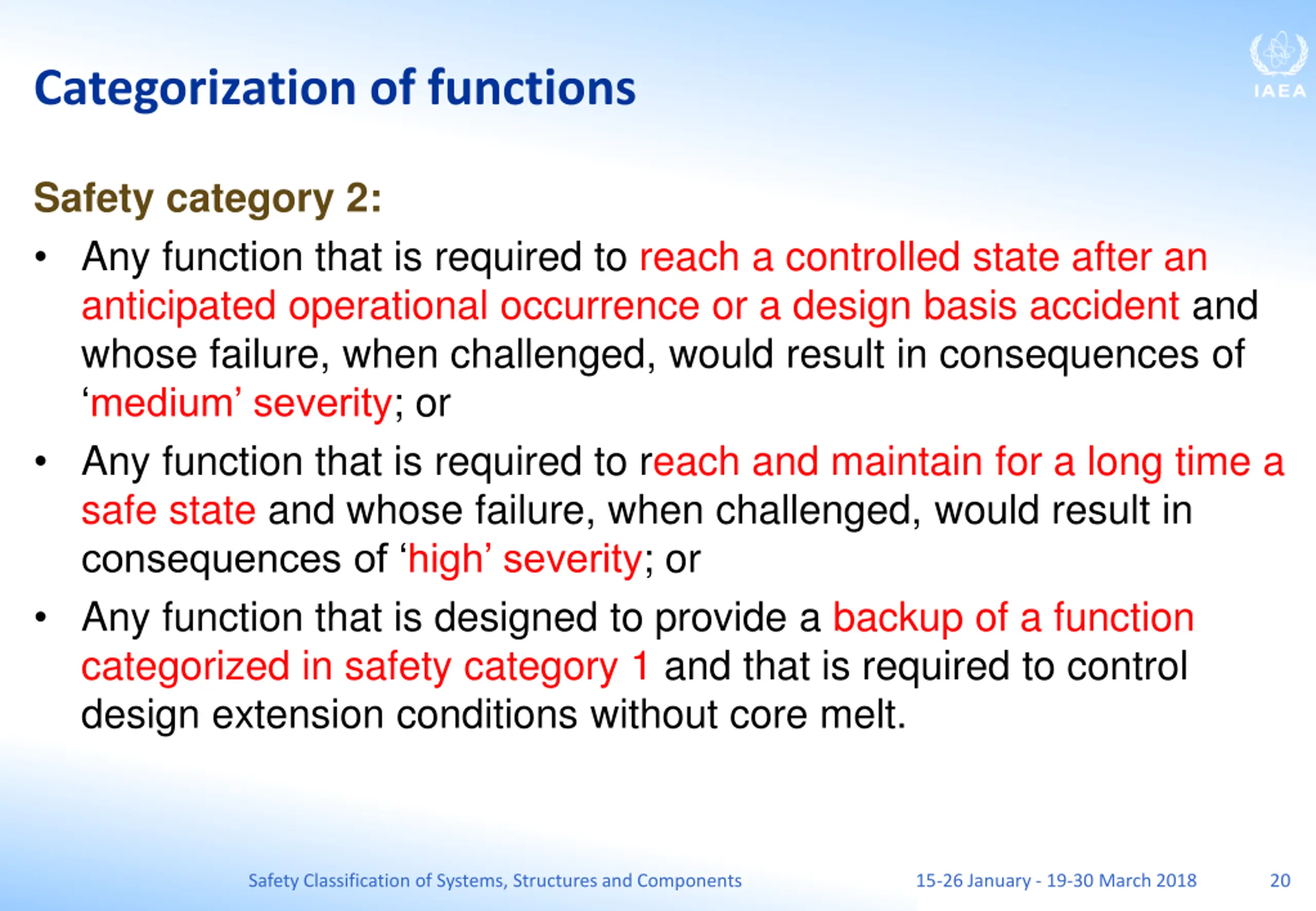 Categorization of functions Safety category 1: Any function that is required to reach the controlled state after an anticipated operational occurrence or a design basis accident and whose failure, when challenged, would result in consequences of high severity. Safety Classification of Systems, Structures and Components 15-26 January - 19-30 March 2018 19
