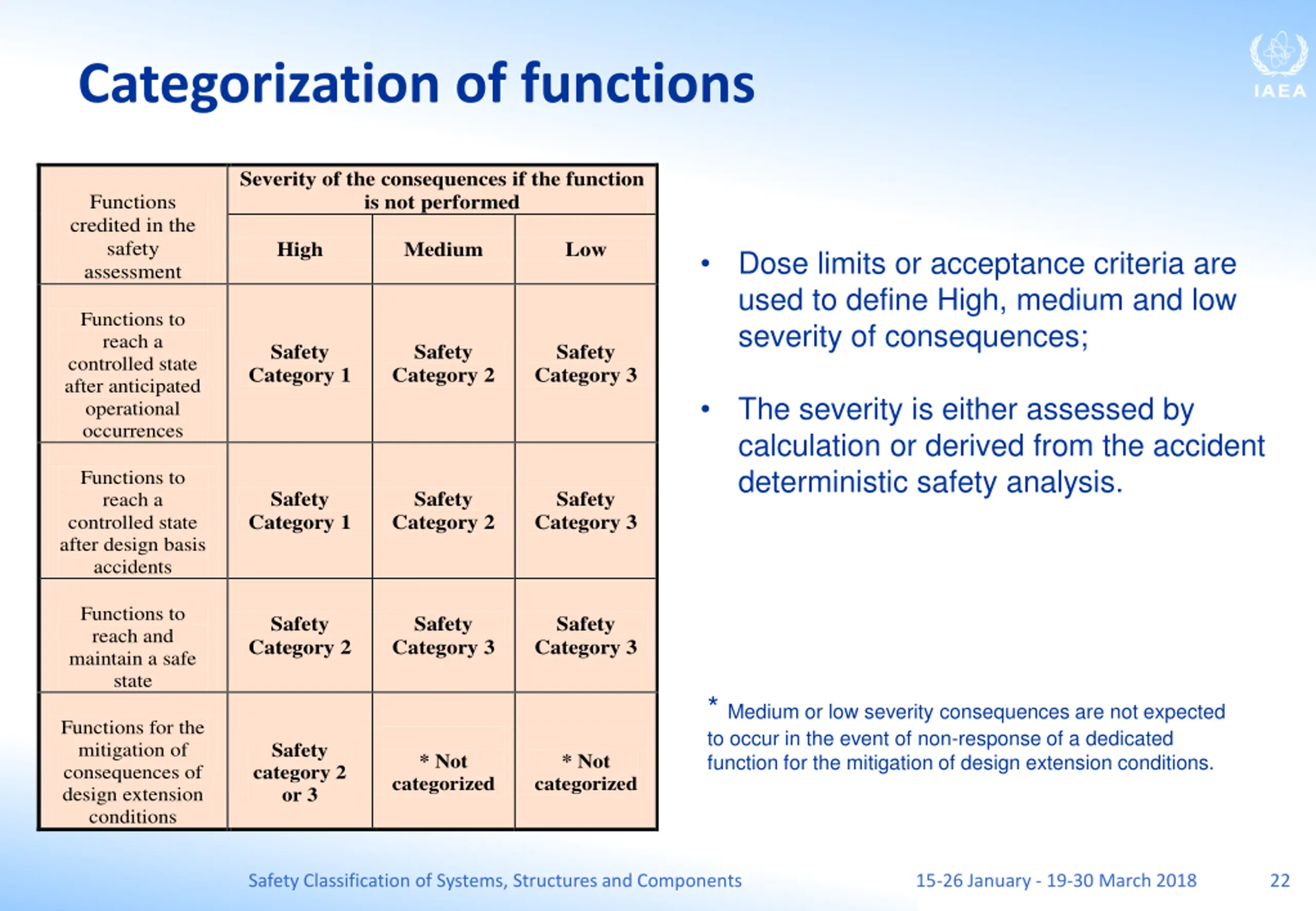 Categorization of functions Safety category 3: Any function that is actuated in the event of an anticipated operational occurrence or design basis accident and whose failure, when challenged, would result in consequences of low severity; or Any function that is required to reach and maintain for a long time a safe state and whose failure, when challenged, would result in consequences of medium severity; or Any function that is required to mitigate the consequences of design extension conditions, unless already required to be categorized in safety category 2, and whose failure, when challenged, would result in consequences of high severity; or ..... Safety Classification of Systems, Structures and Components 15-26 January - 19-30 March 2018 21