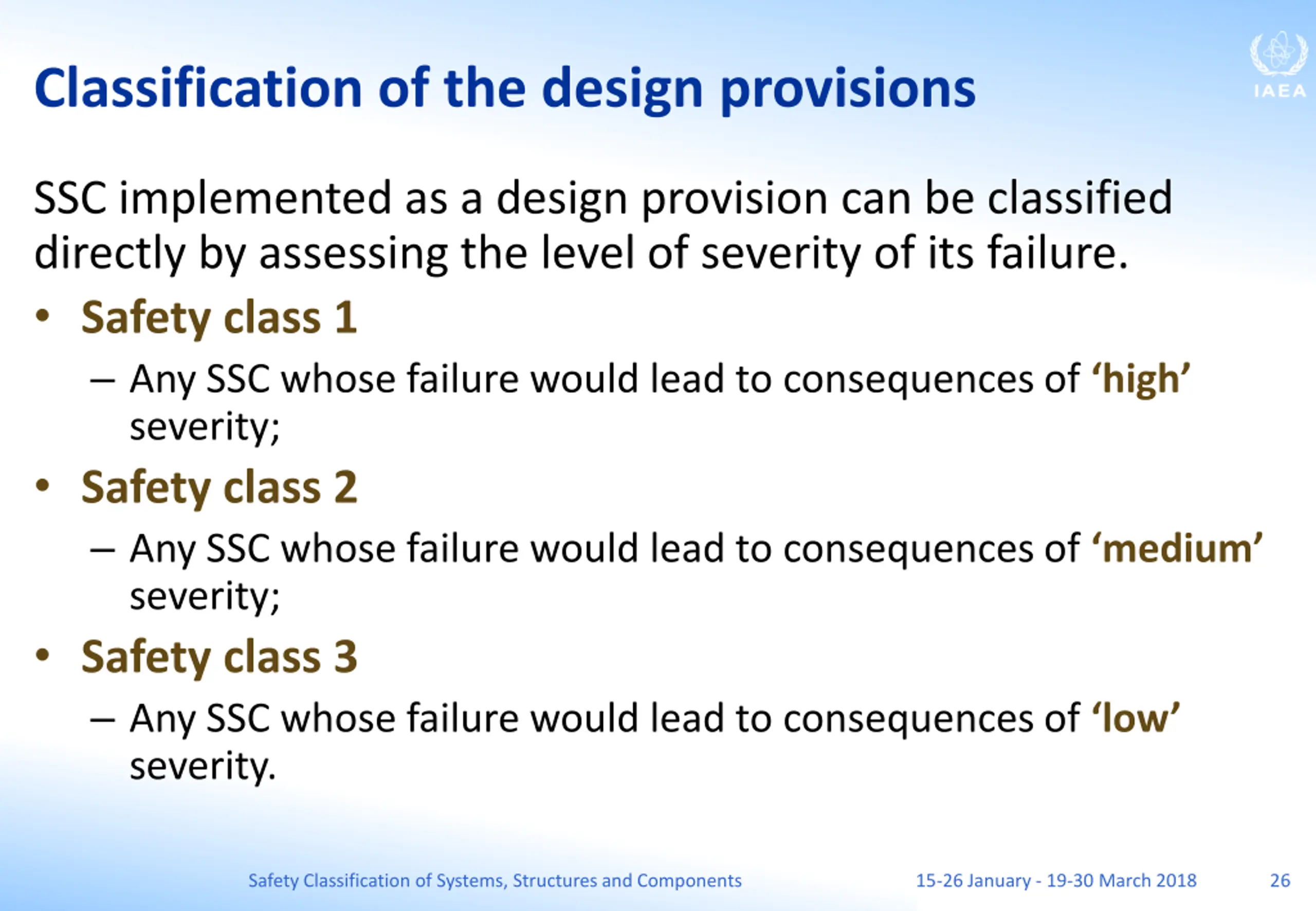 Classification of the design provisions SSC implemented as a design provision can be classified directly by assessing the level of severity of its failure. Safety class 1 Any SSC whose failure would lead to consequences of high severity; Safety class 2 Any SSC whose failure would lead to consequences of medium severity; Safety class 3 Any SSC whose failure would lead to consequences of low severity. Safety Classification of Systems, Structures and Components 15-26 January - 19-30 March 2018 26