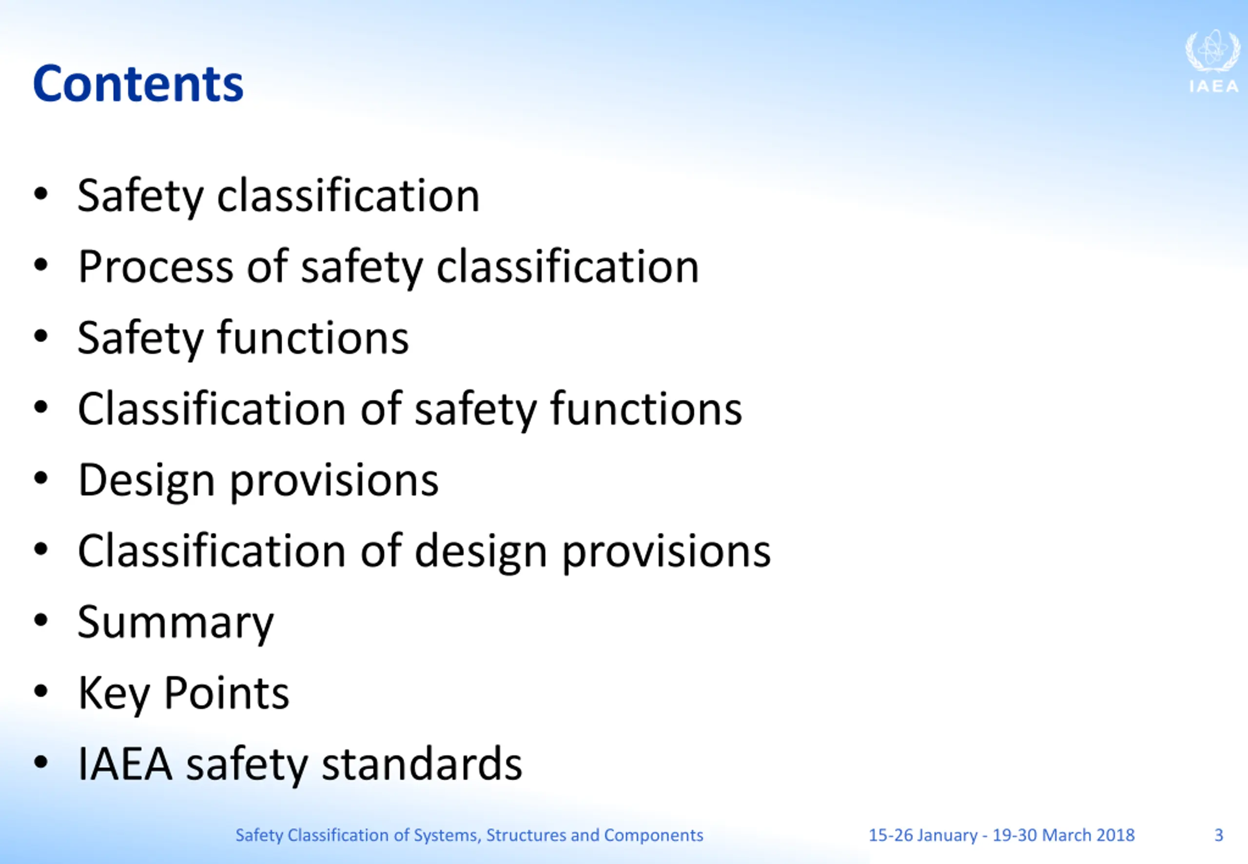 Contents Safety classification Process of safety classification Safety functions Classification of safety functions Design provisions Classification of design provisions Summary Key Points IAEA safety standards Safety Classification of Systems, Structures and Components 15-26 January - 19-30 March 2018 3