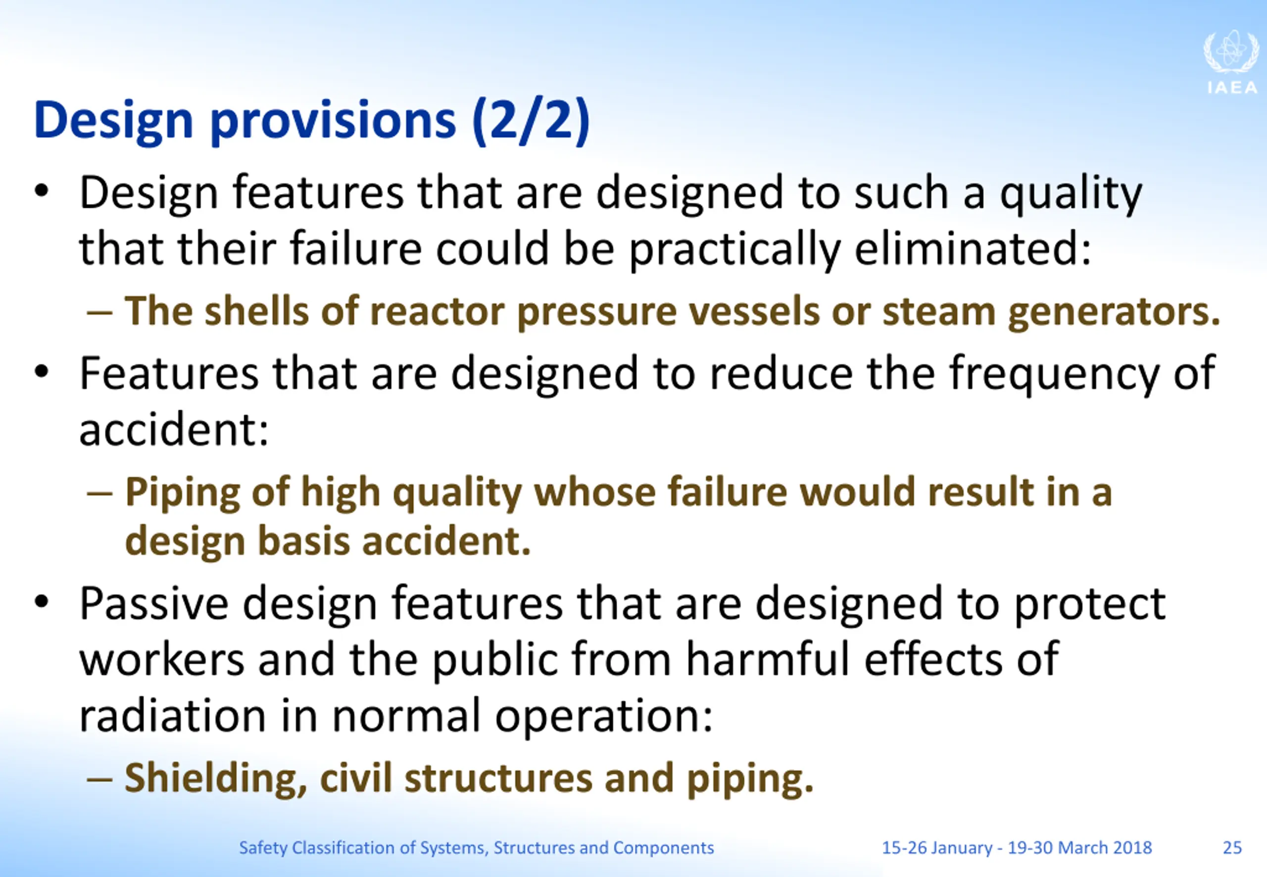 Design provisions (1/2) The safety of the plant is also dependent on the reliability of different equipment which, unlike to systems, is not called upon an event. That equipment designated as Design provision is necessary to prevent accidents, to limit propagation of the effects of hazards, to protect workers and the public of radiation risks. Safety Classification of Systems, Structures and Components 15-26 January - 19-30 March 2018 24